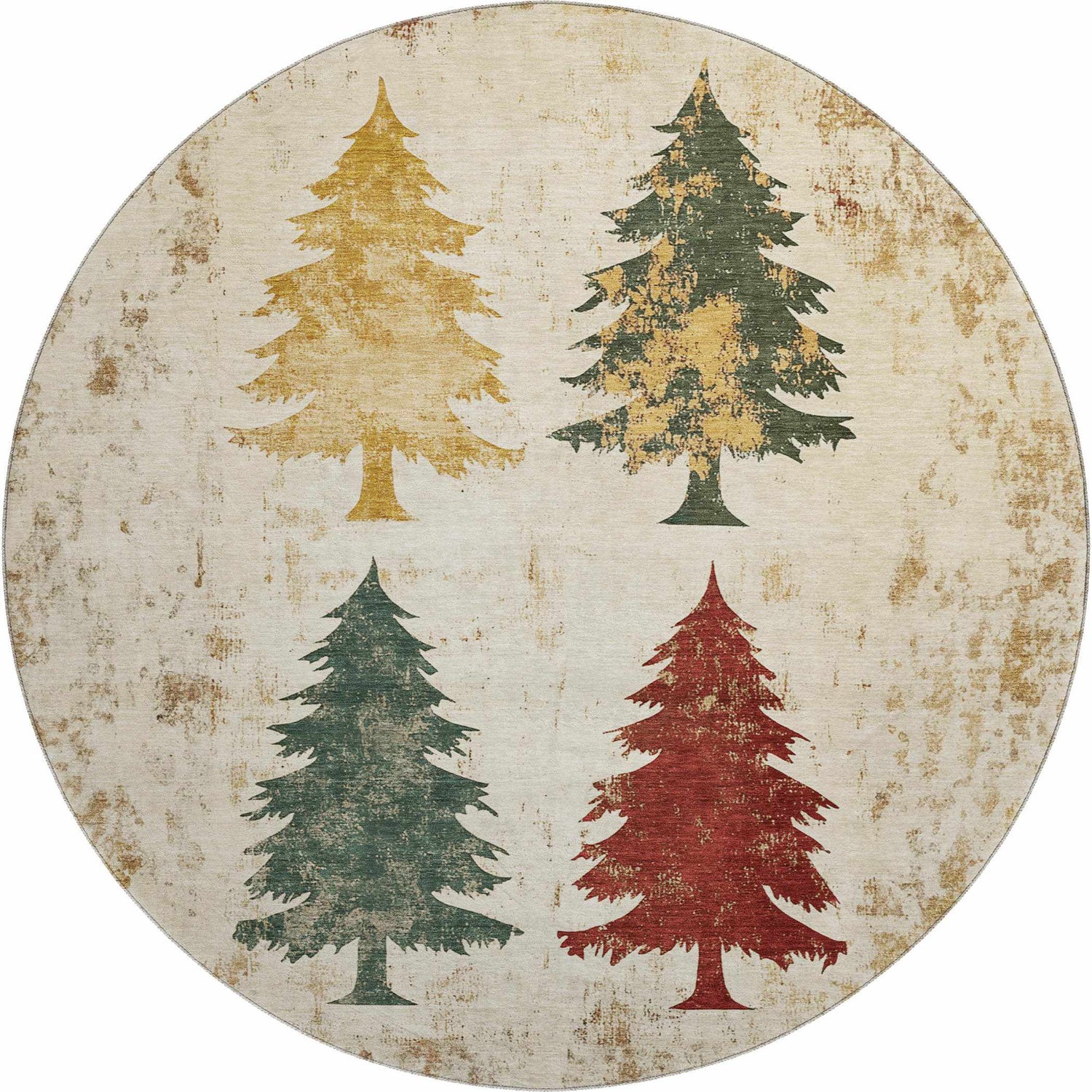 warm paletteA warm ivory base anchors four Christmas tree silhouettes in deep forest green, rich cranberry red, golden mustard yellow, and a distressed blend of green and gold — the worn, faded finish gives the whole palette a cozy, vintage cabin feel.