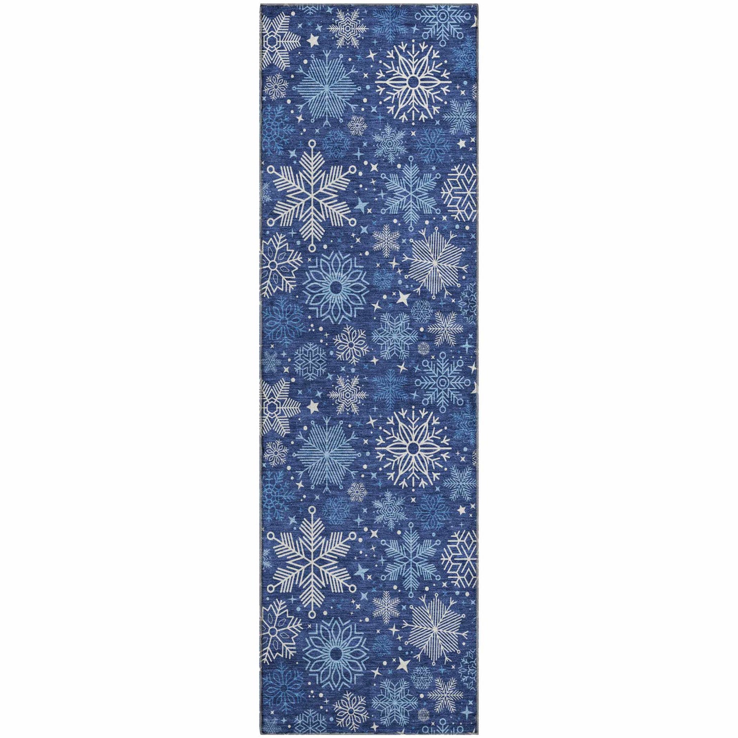 A rectangular area rug with a deep navy blue base covering the entire field. Scattered across the surface in an allover, non-repeating arrangement are snowflakes of varying sizes — some large and intricately detailed in bright white, others medium-sized in light icy blue, and smaller ones in silver-gray tones. Tiny four-pointed star accents are distributed between the snowflakes, adding sparkle and depth. The snowflakes feature different crystalline designs — some with branching arms, others with circular or hexagonal structures — giving the pattern visual variety. The pile is medium height with a smooth, machine-woven surface texture. Edges are cleanly bound with no fringe or tassels. The overall impression is of a winter night sky rendered in textile form — elegant, cool, and seasonally festive.