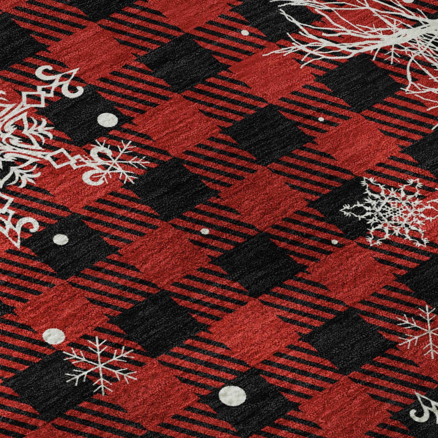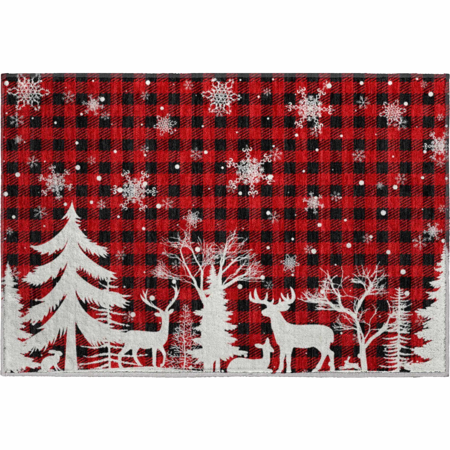 Bold red buffalo plaid meets a white winter woodland scene — this washable, outdoor-safe Christmas rug is festive enough for the holidays and tough enough for real life.