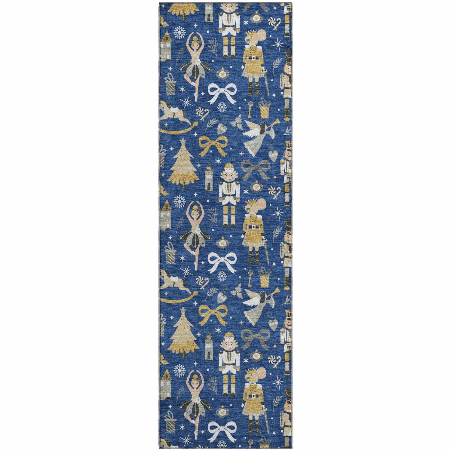 A rectangular area rug with a deep, saturated navy blue field covered in an allover repeating holiday motif pattern. The motifs include gold and ivory nutcracker soldiers, soft gray reindeer, white doves in flight, stylized Christmas trees, snowflakes, ribbon bows, and small floral sprigs — all rendered in gold, ivory, beige, cream, and soft gray tones against the navy ground. The pattern repeats in a structured grid across the entire surface with no border. The pile is medium height with a smooth, machine-woven texture and a slightly matte finish. Edges are cleanly bound with no fringe or tassels. The overall impression is a festive Scandinavian-inspired holiday design that feels refined and graphic rather than kitschy.