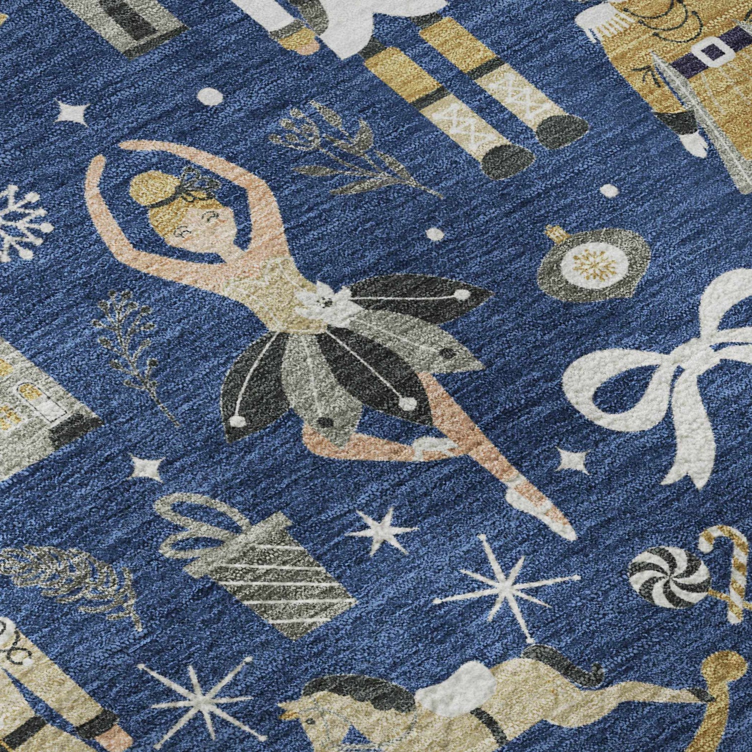 A navy blue holiday rug packed with nutcrackers, reindeer, and snowflakes — and it's fully machine washable. Festive style that survives the season.