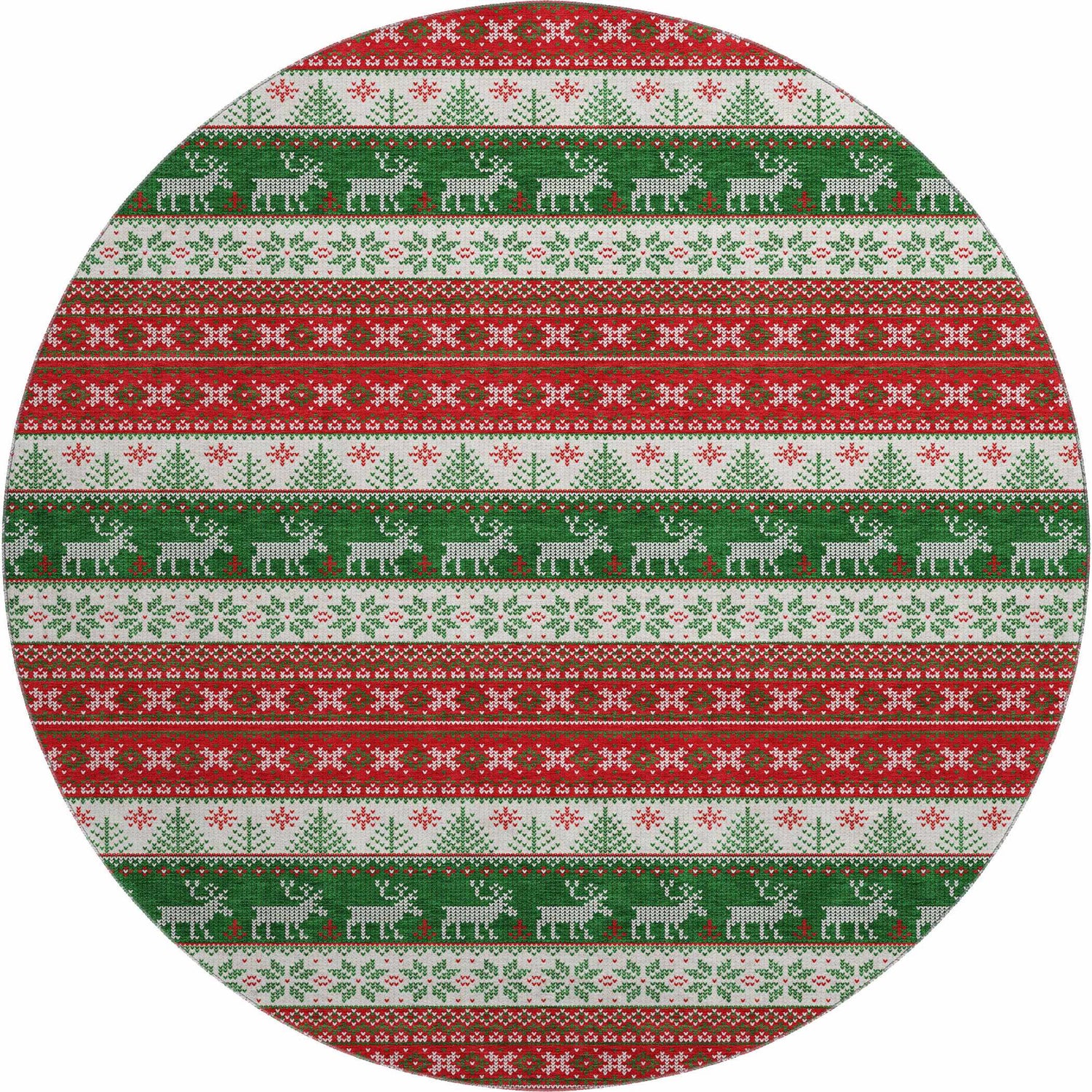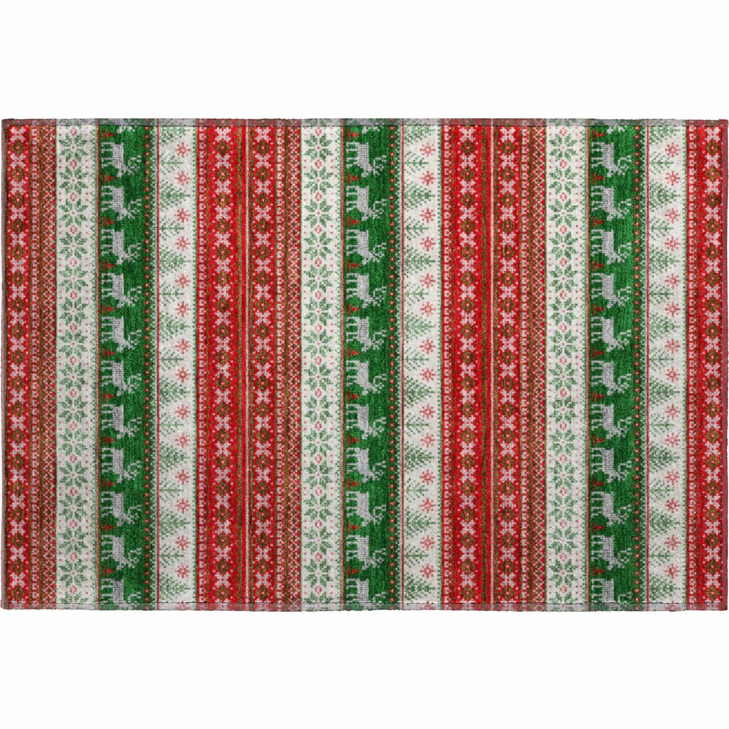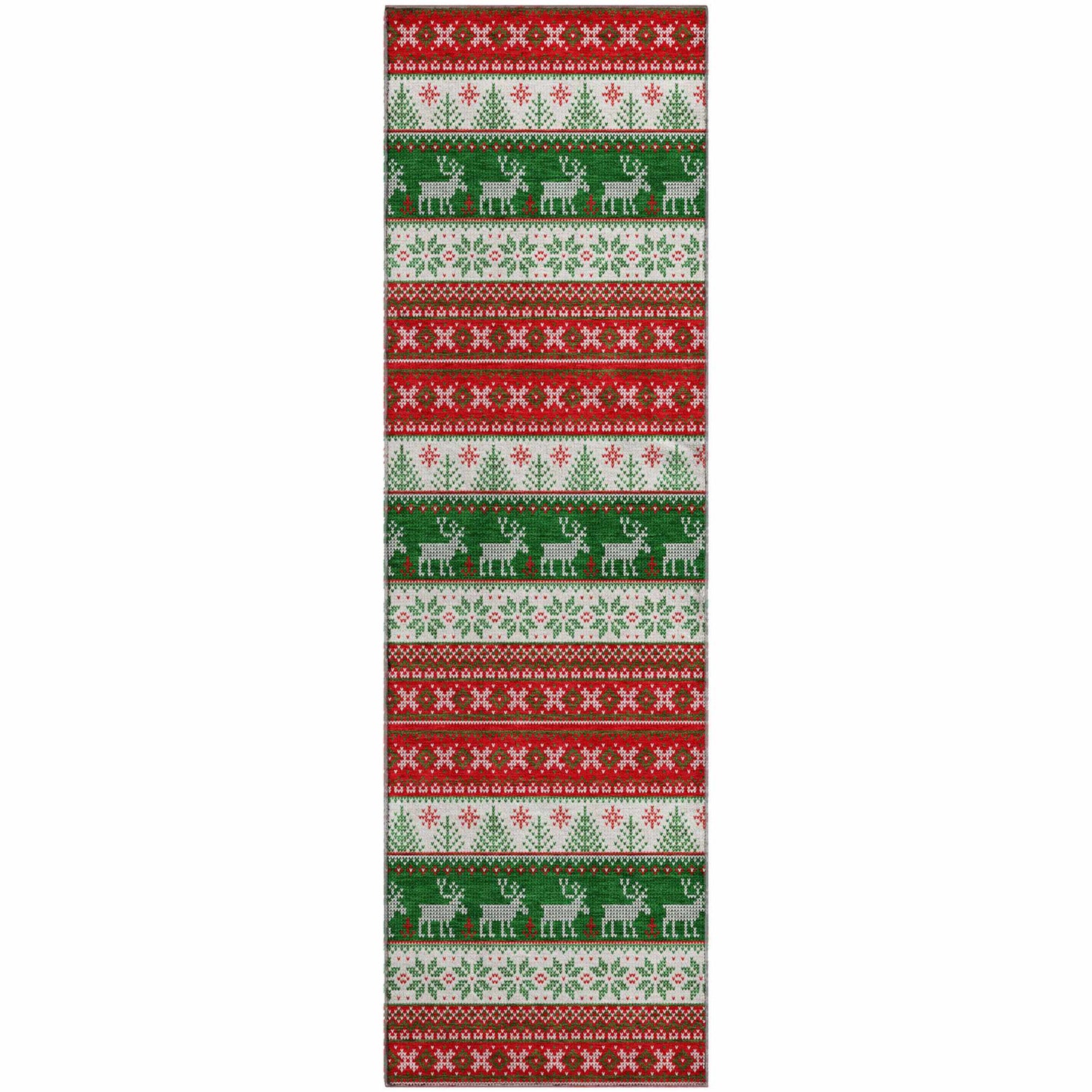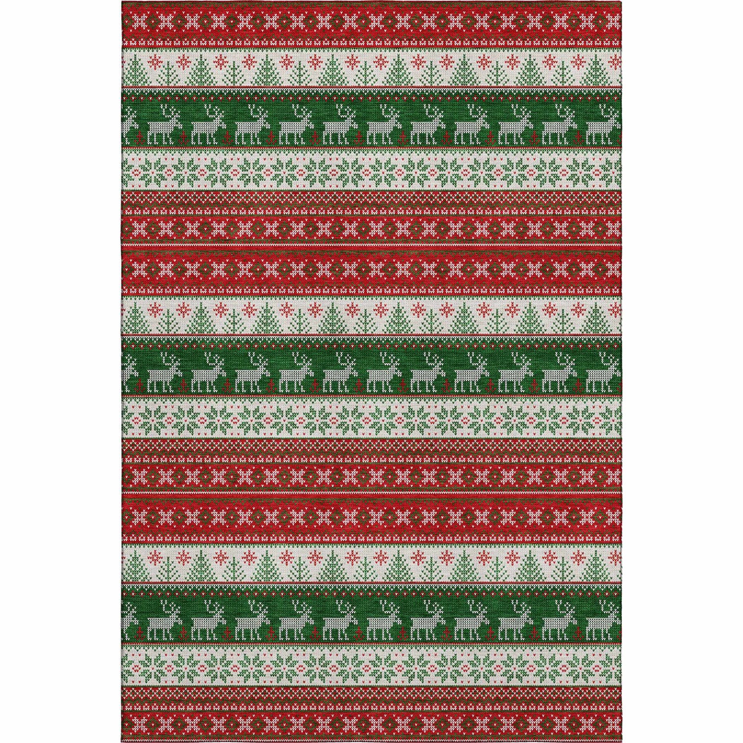 Festive Nordic stripes with reindeer and snowflakes in bold red and green — this washable, outdoor-safe rug brings Christmas charm anywhere in your home.