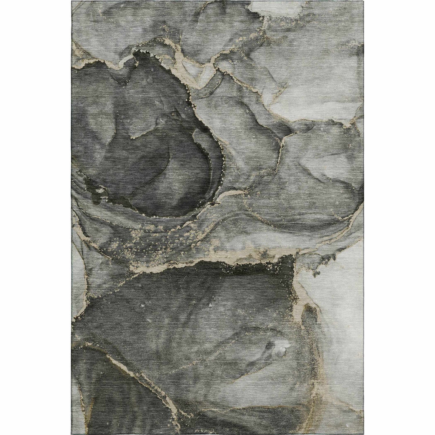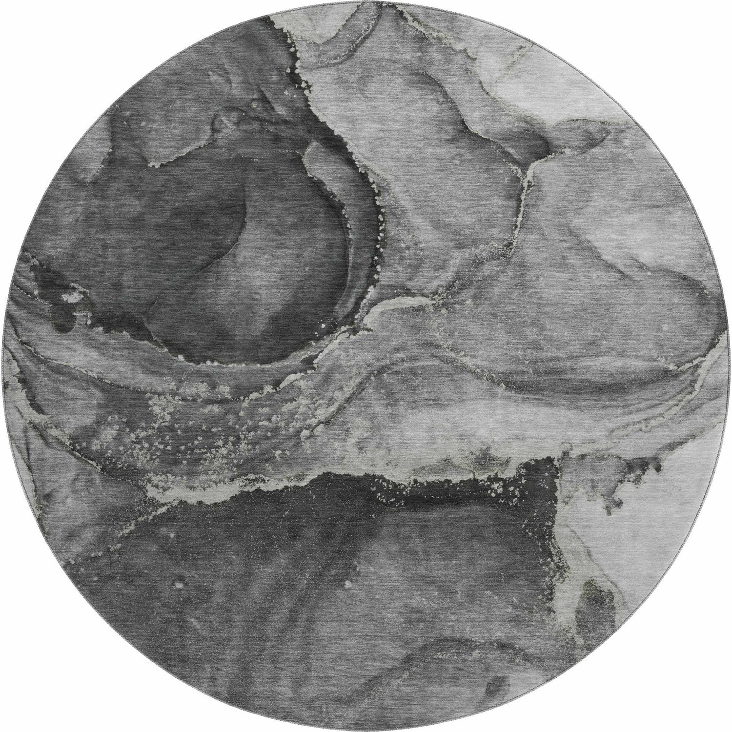 A moody, marble-inspired abstract in deep charcoal and gray — fully washable, rubber-backed, and tough enough for indoors or out.