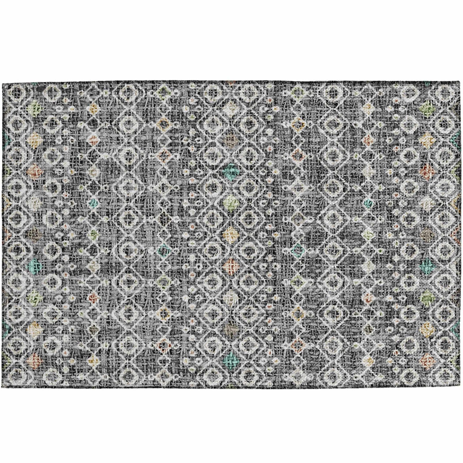 A rectangular area rug with a deep charcoal black base covered in an allover repeating geometric diamond and trellis lattice pattern rendered in crisp white. The white lines form interlocking diamonds and small square motifs arranged in a dense, symmetrical grid across the entire field. Scattered throughout the pattern are tiny accent details in muted green, orange, and teal, adding subtle multicolor depth to the otherwise high-contrast black and white design. The rug has a defined outer border that frames the geometric field. The surface texture is low and tight — a smooth, machine-woven low pile with a slightly textured appearance. Edges are cleanly bound with no fringe or tassels. Overall impression: bold, graphic, and modern with a nod to traditional tile and lattice motifs.