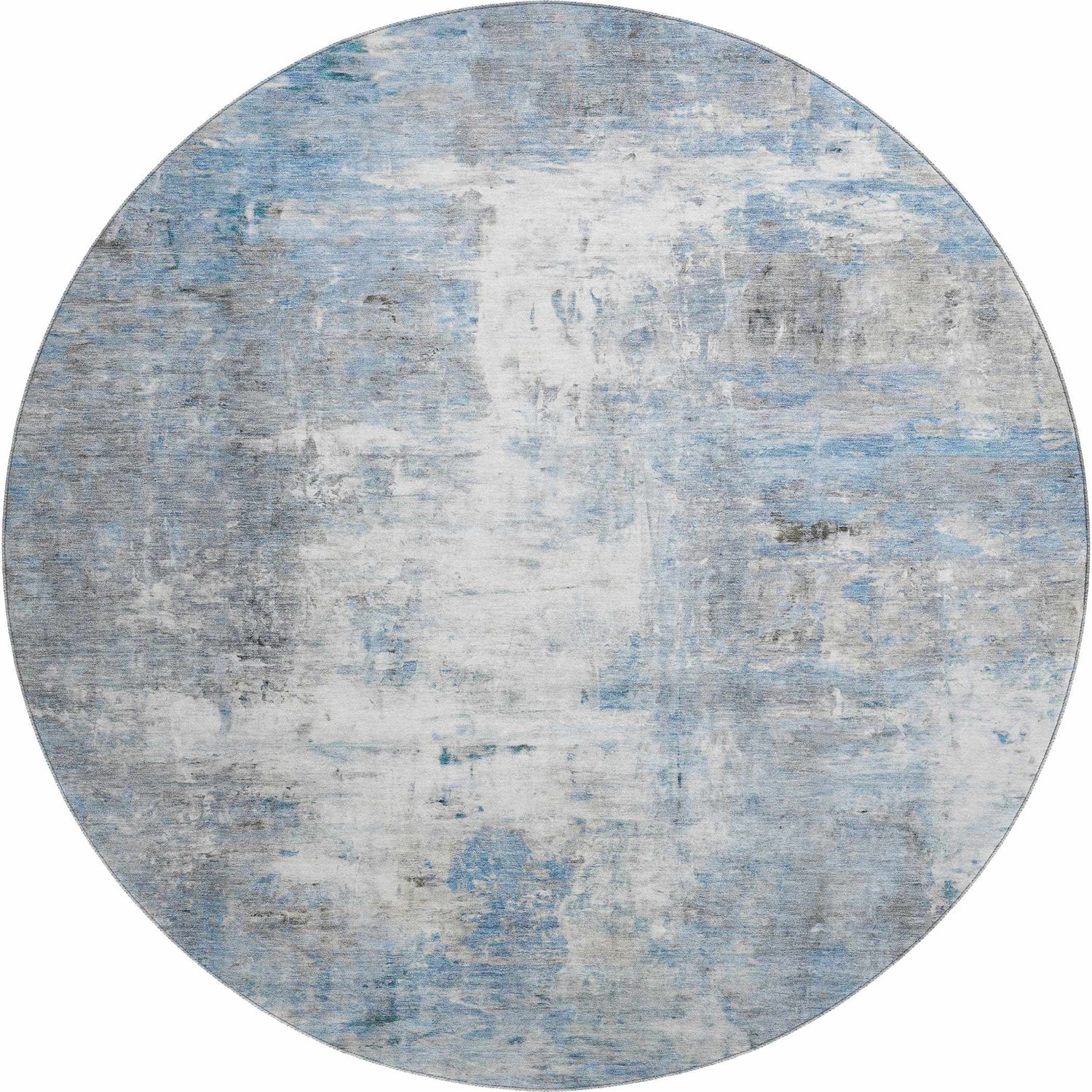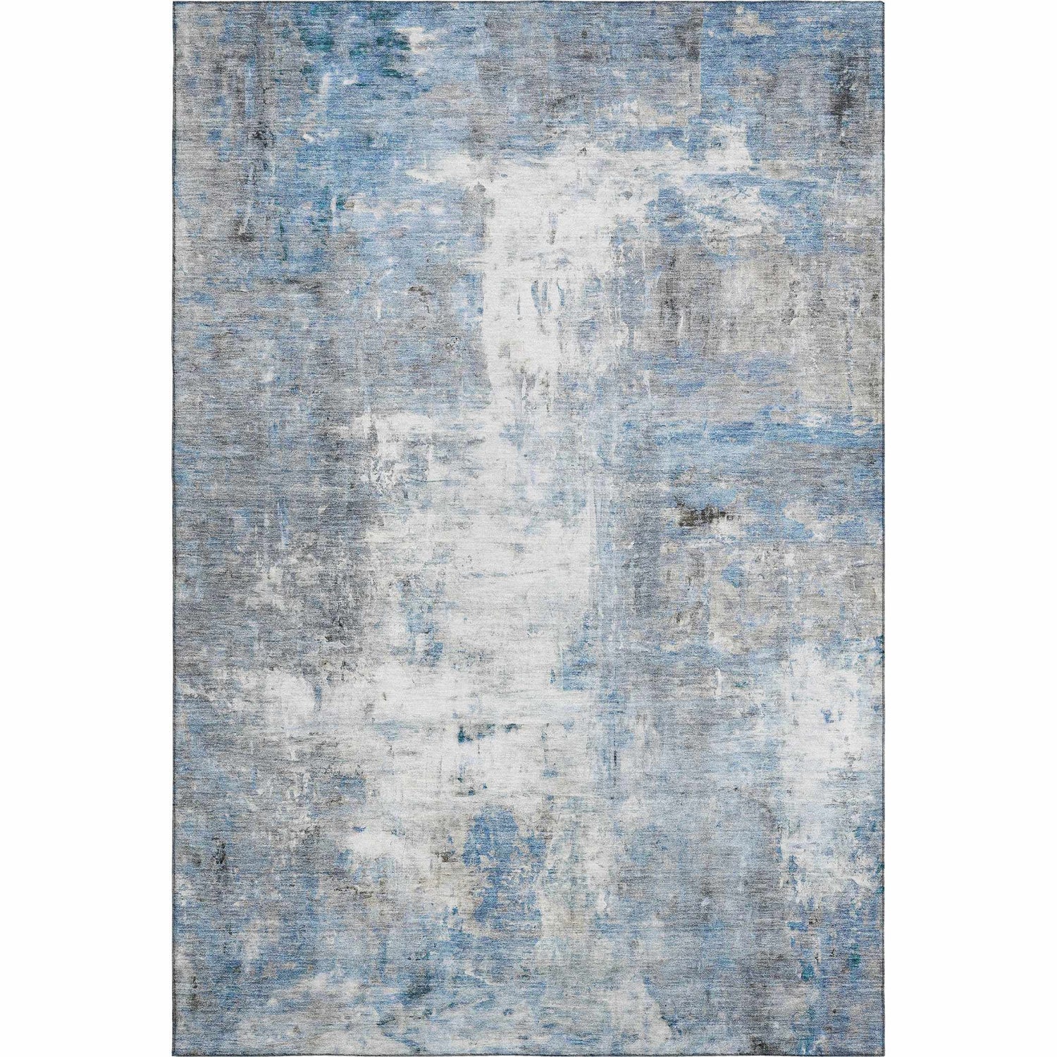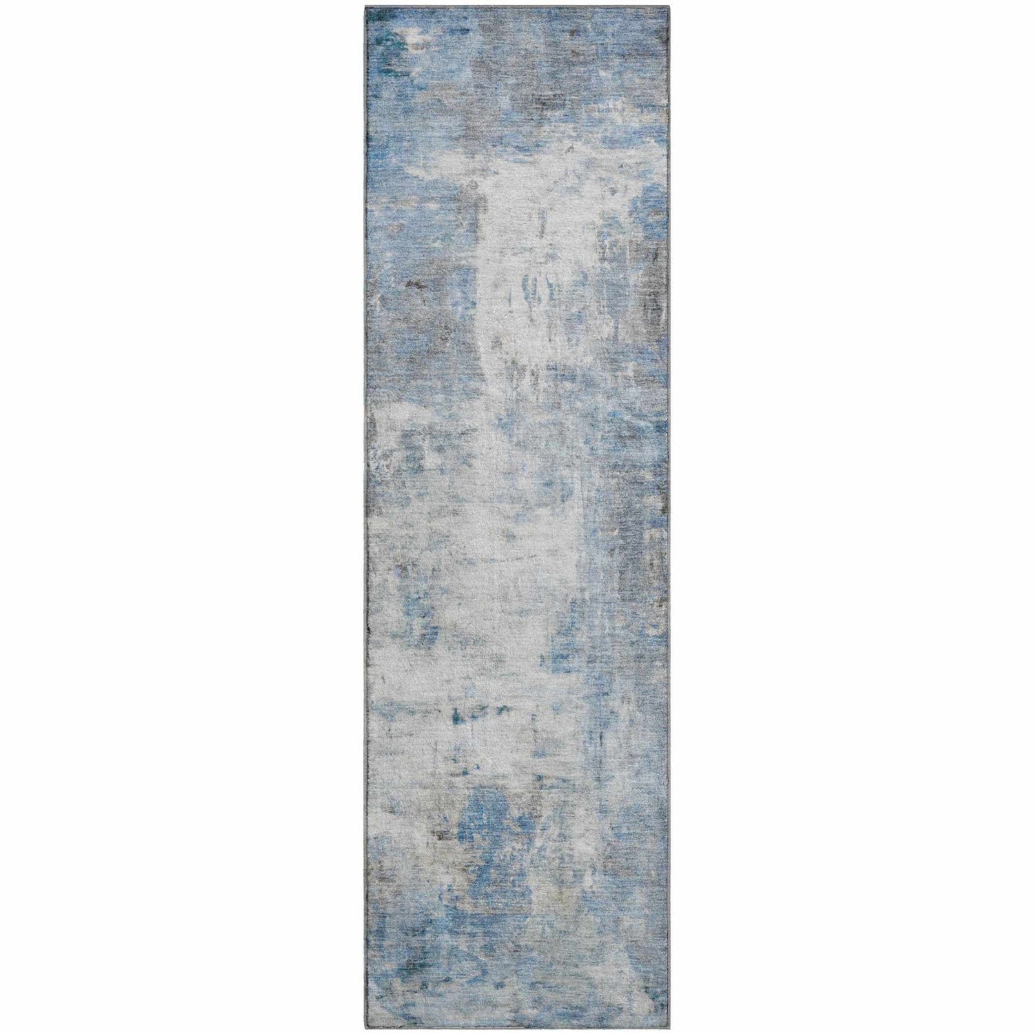 A rectangular area rug with an allover abstract, watercolor-style pattern in cool blue and soft gray tones. The blue — ranging from medium sky blue to deeper slate — is distributed unevenly across the surface, creating an organic, painterly effect with no defined repeat. Lighter silvery-white areas appear in the center and scattered throughout, giving the impression of faded or bleached patches. Darker charcoal gray accents add depth and contrast. The surface has a smooth, medium-pile machine-woven texture with a subtle sheen. Edges are cleanly bound with no fringe or tassels. The overall impression is of a modern abstract painting rendered as a rug — cool-toned, artistic, and intentionally distressed-looking.