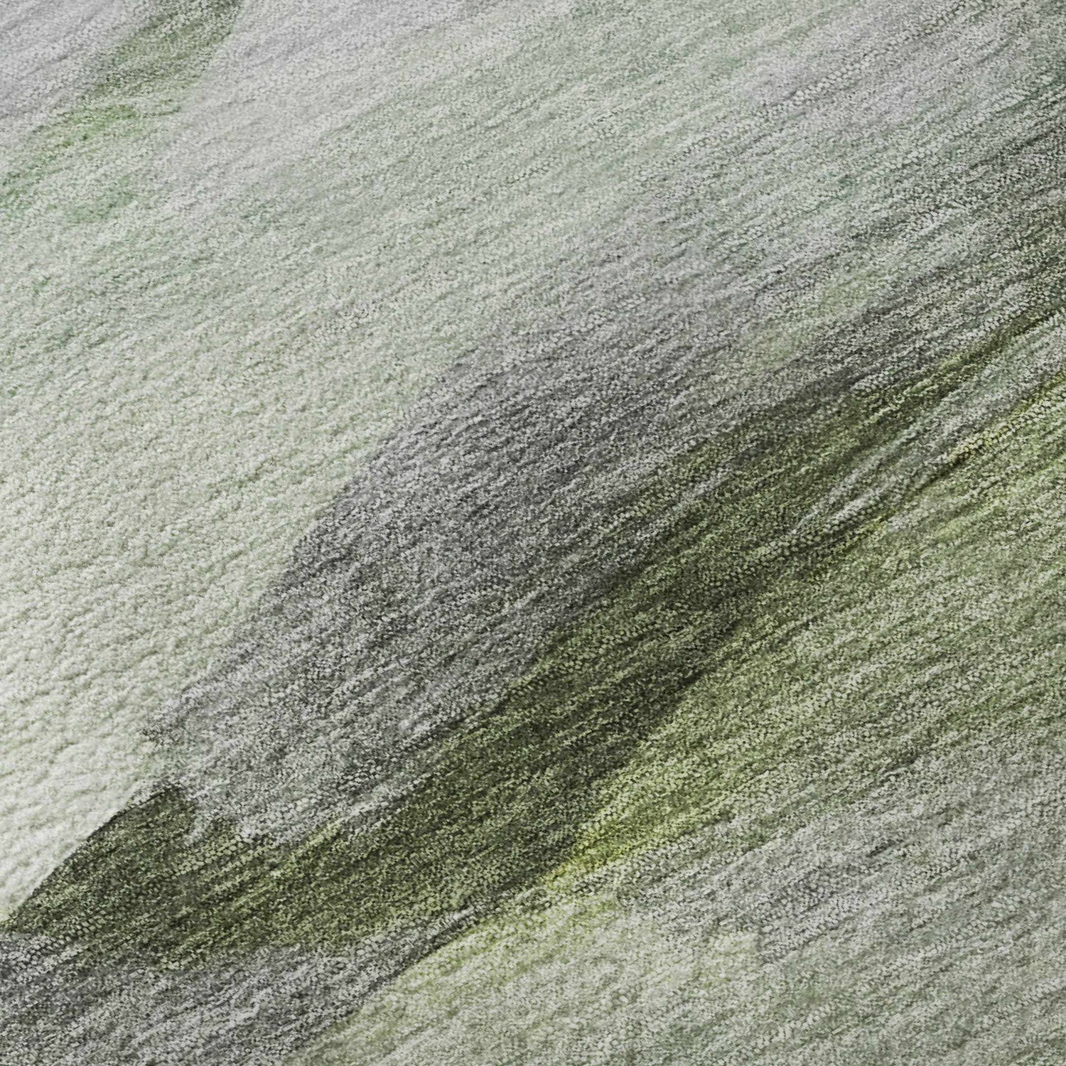 A painterly abstract rug in soft greens and misty gray — machine washable, outdoor safe, and stylish enough for any room inside or out.