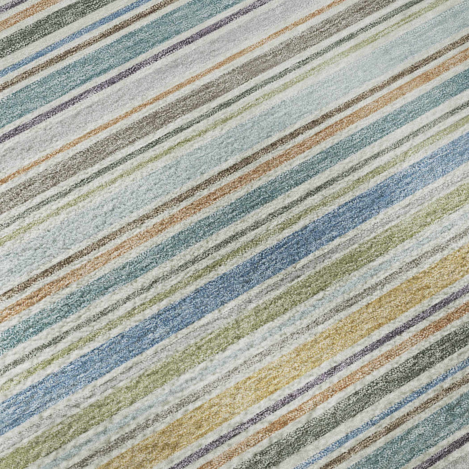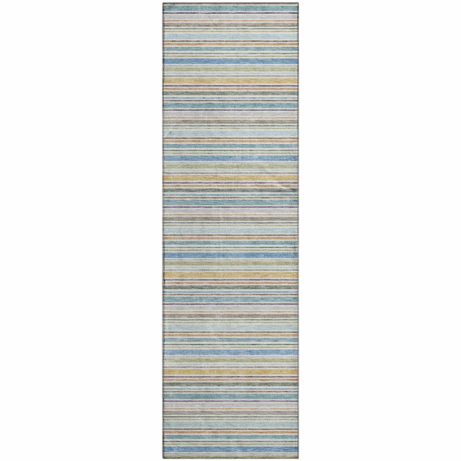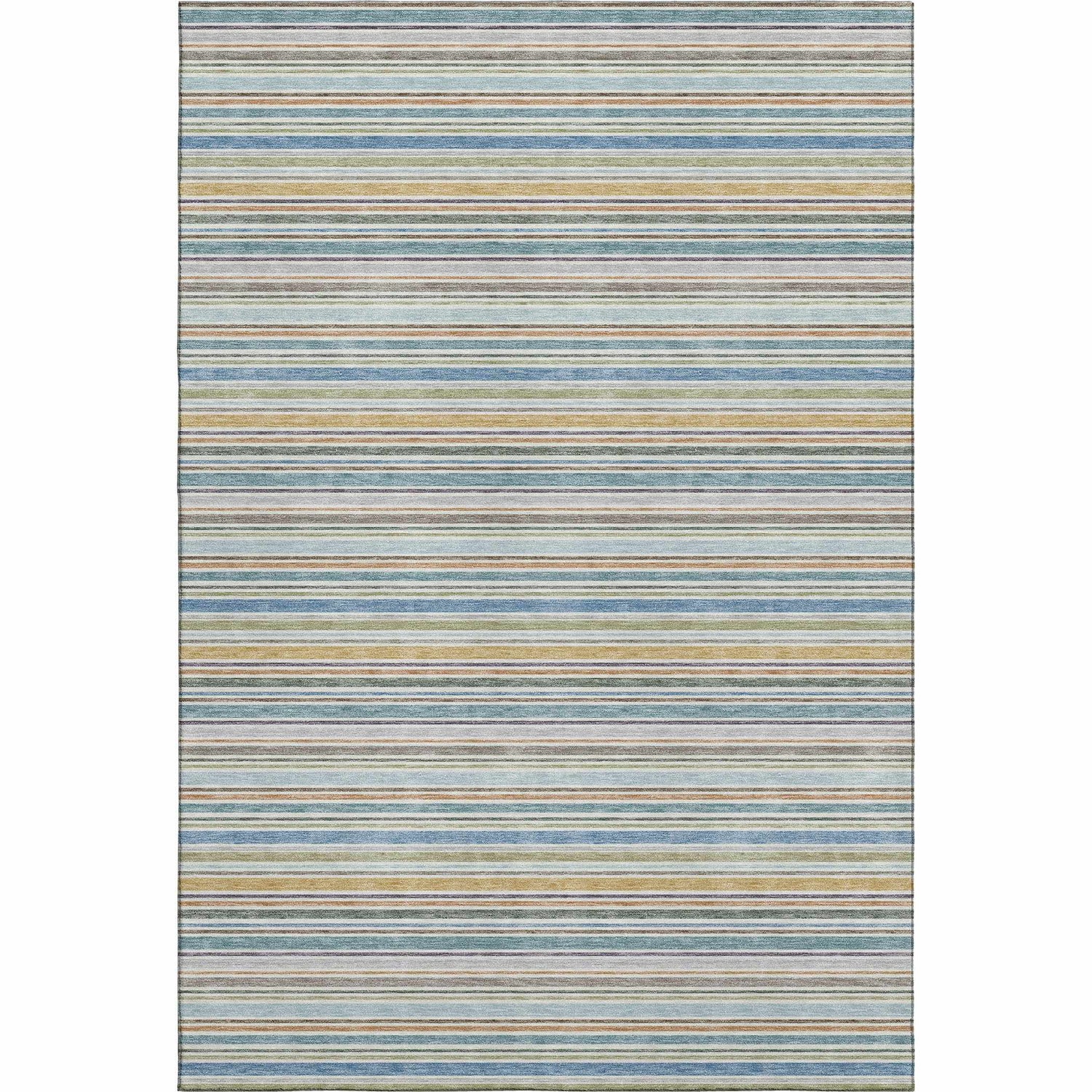 Breezy multicolor stripes in coastal blues, greens, and yellows — machine washable, rubber backed, and outdoor safe for effortless everyday living.