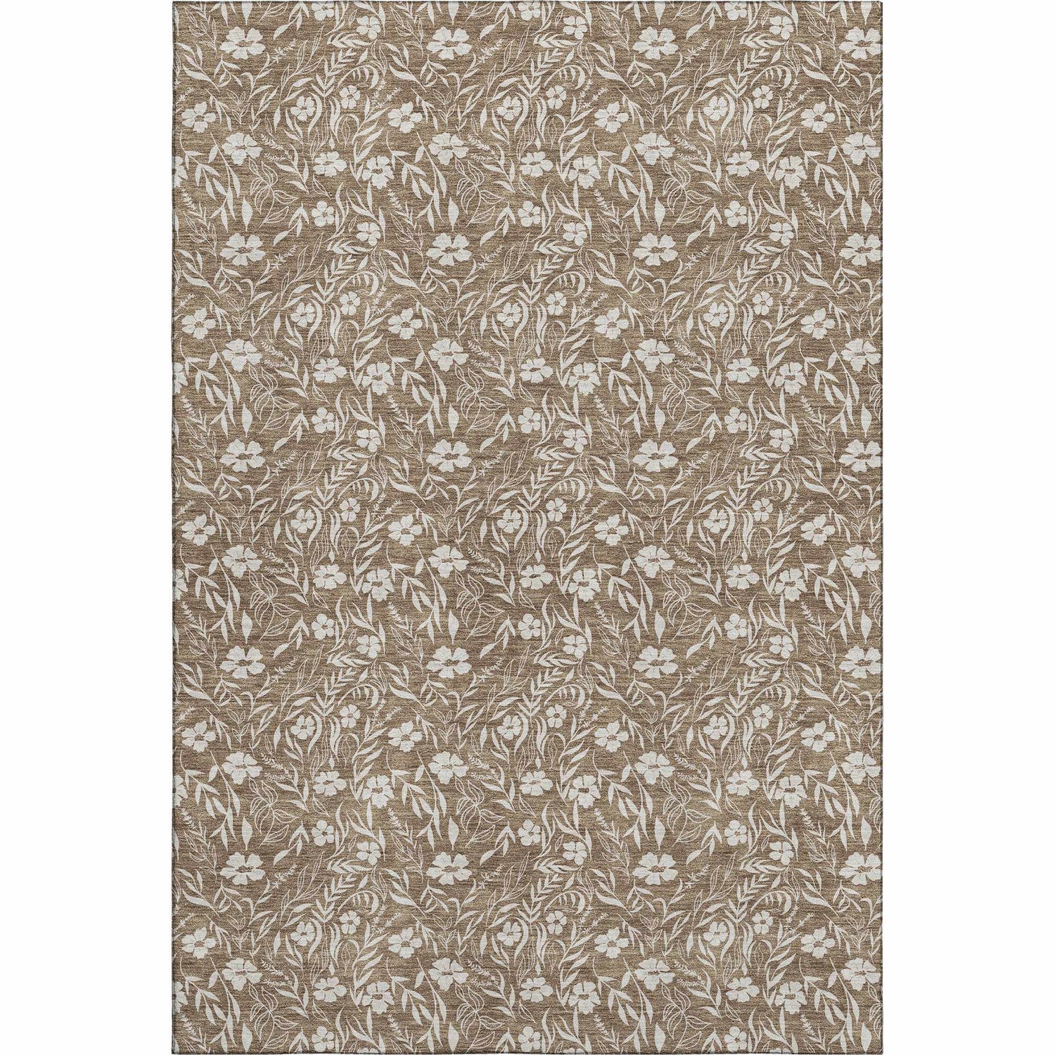 A rectangular area rug with a warm mocha brown base covering approximately 65% of the surface. An allover repeating pattern of five-petal white flowers and elongated white leaves trails across the entire field in a loose, organic arrangement — no border, no medallion, just continuous botanical motifs. The white pattern elements have a slightly softened, printed quality against the textured brown ground, giving the surface a woven, natural-fiber appearance despite being synthetic. The pile is low-to-medium, smooth and uniform. Edges are cleanly bound with no fringe or tassels. The overall impression is of a casual, nature-inspired rug with a warm earthy palette and a relaxed, cottage-like character.