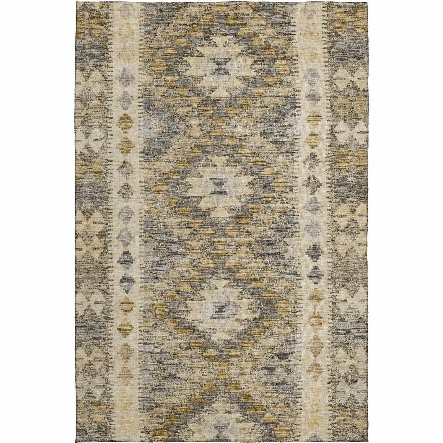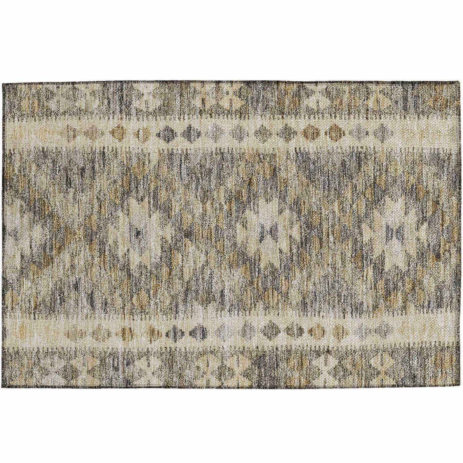 A tribal ikat design in warm beige, gray, and mustard — machine washable, rubber-backed, and ready for indoors or out. Real-life style that cleans up in minutes.