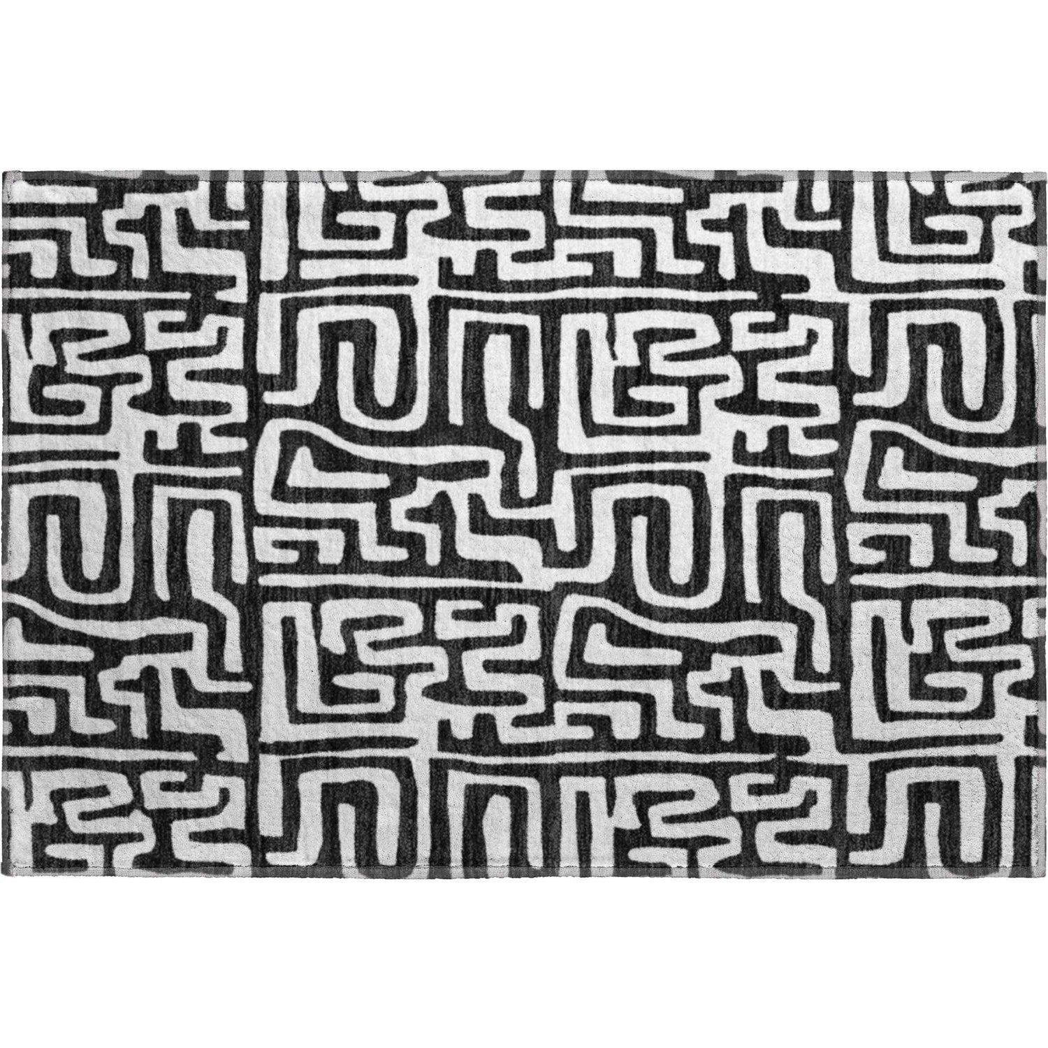 A rectangular area rug with an allover abstract labyrinth pattern rendered in high-contrast black and white. The deep black background is filled edge-to-edge with continuous, winding white lines that form a complex maze-like or tribal-inspired geometric network — no central medallion or border, just a dense, repeating organic maze that fills the entire field. The white lines vary slightly in width and curve organically, giving the pattern a hand-drawn quality despite being machine-made. The pile is medium height with a slightly textured surface visible in the weave. Edges are cleanly bound with no fringe or tassels. The overall impression is bold, graphic, and modern — like abstract art underfoot.