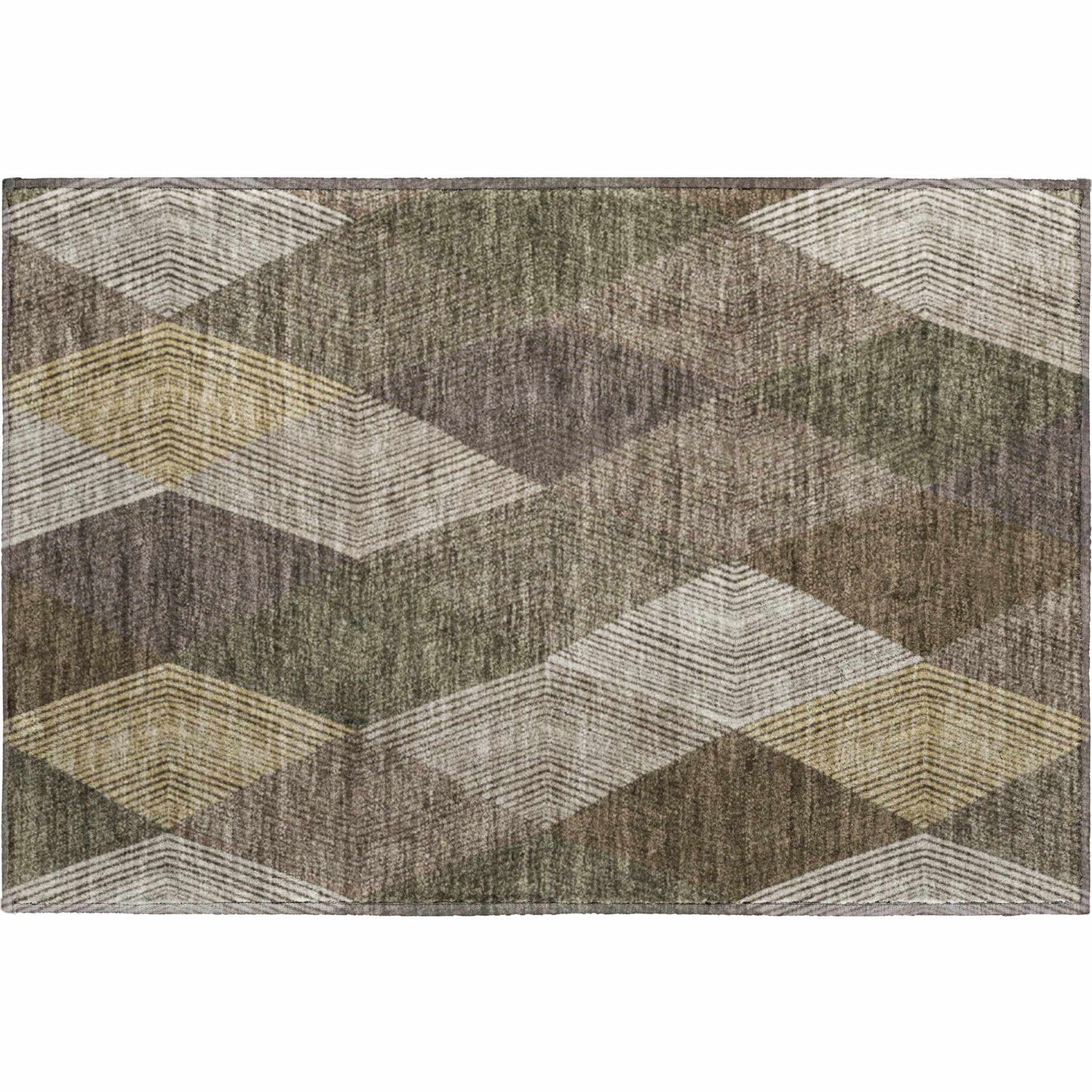A bold 3D geometric diamond pattern in warm browns, grays, and olive — washable, outdoor-safe, and built for real life without sacrificing style.