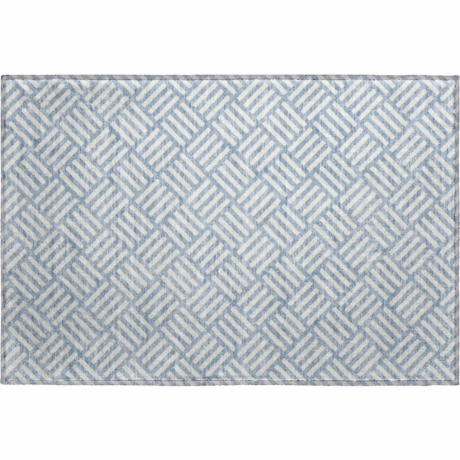 A rectangular area rug with a soft denim blue and creamy white allover geometric lattice pattern. The design features diagonal diamond-shaped blocks, each filled with fine parallel stripes running in alternating directions — creating a classic basketweave or woven tile visual effect. The blue tones are mid-range and slightly muted, giving the rug a soft, coastal feel rather than a bold primary blue. The white ground is clean and bright, providing strong contrast. The surface has a smooth, low-to-medium pile texture with a machine-woven appearance. Edges are cleanly bound with no fringe or tassels. The overall impression is crisp, modern, and geometric — light and airy at a glance.