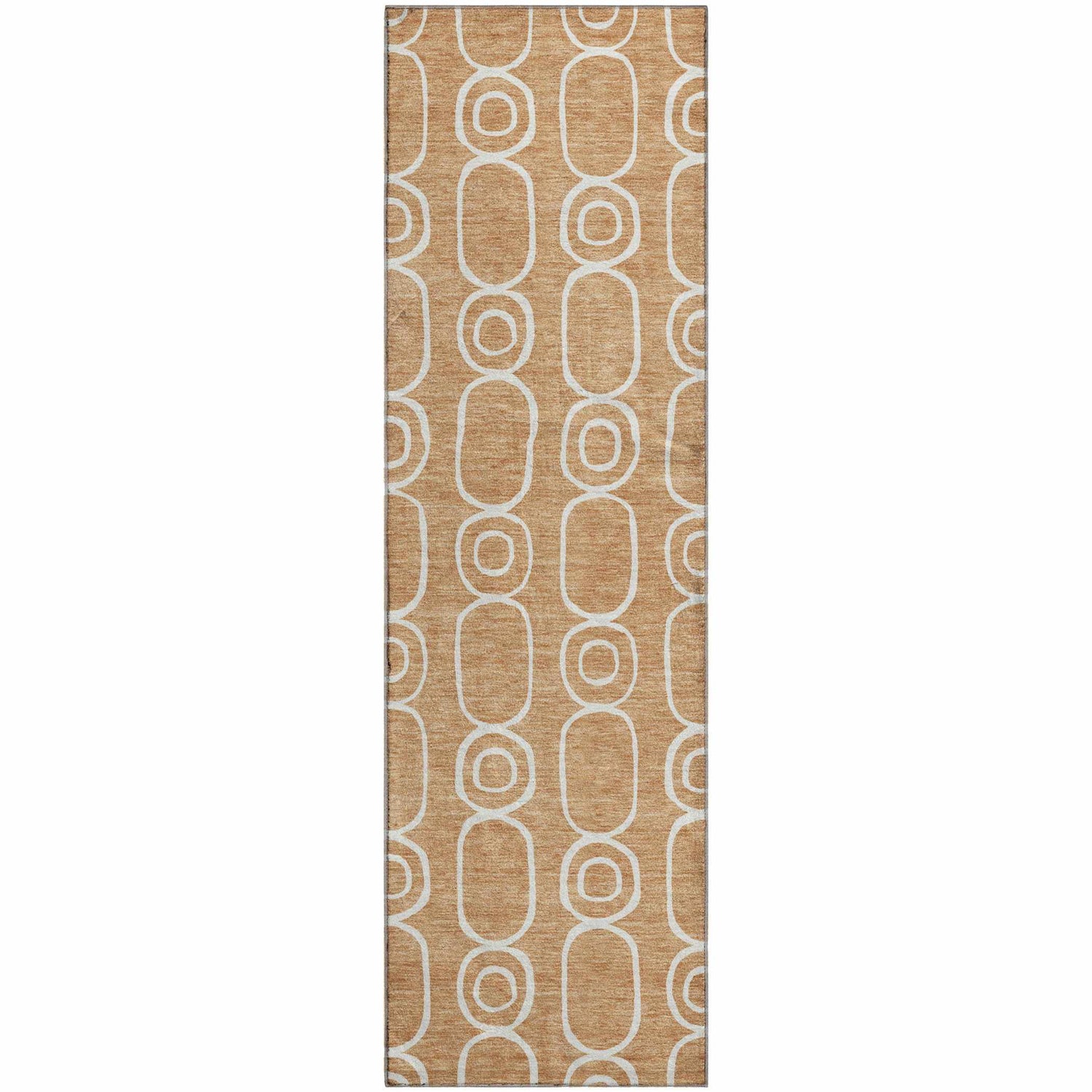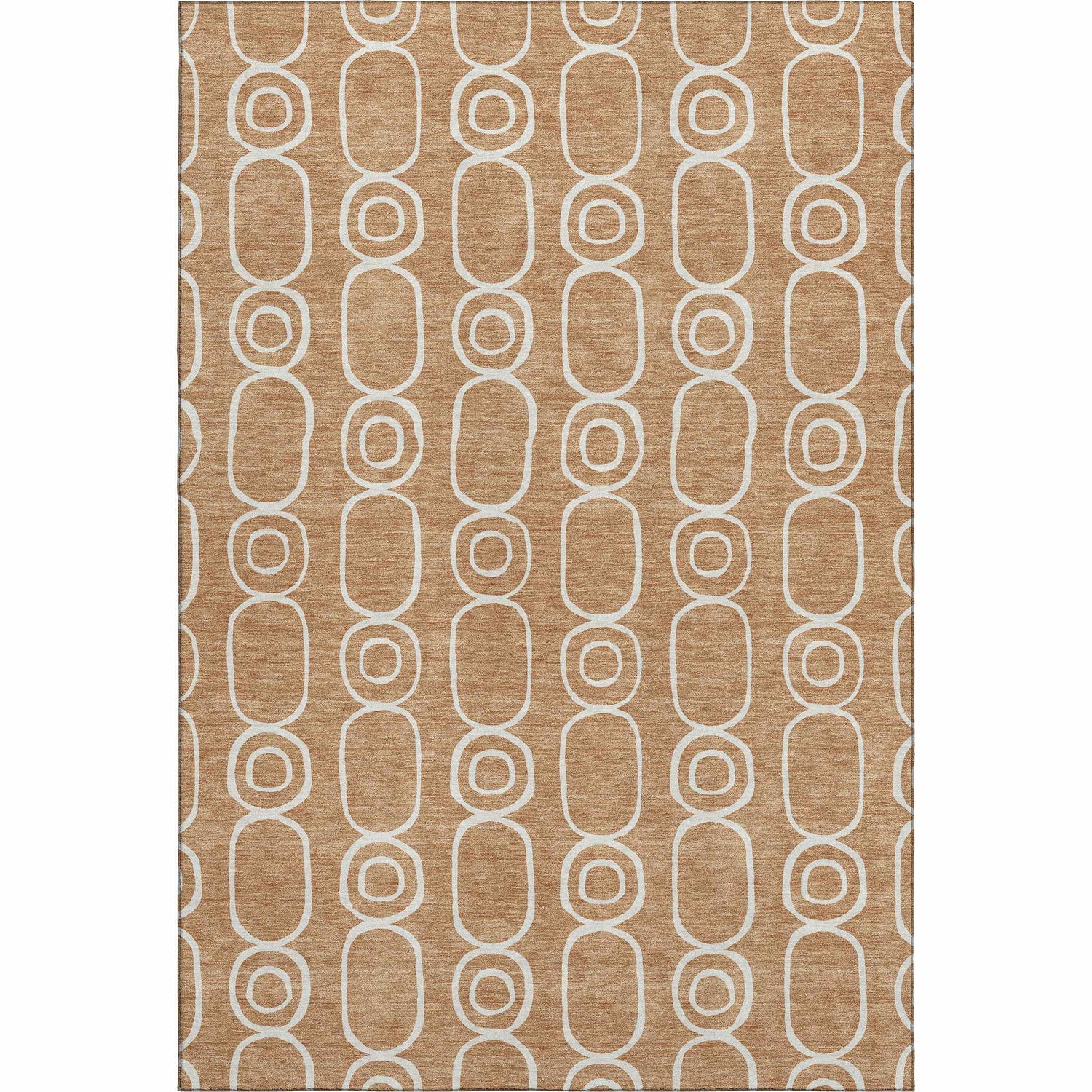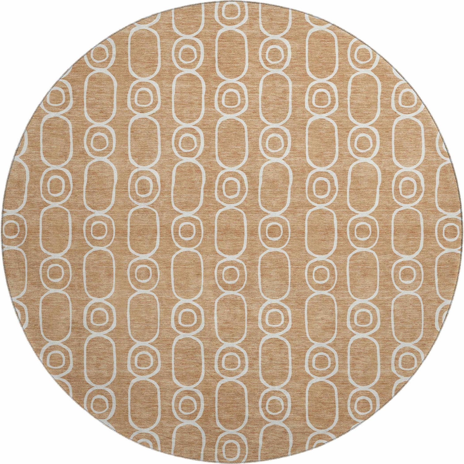 A warm tan rug with crisp white geometric circles — fully washable, outdoor-safe, and stylish enough for any room inside or out.