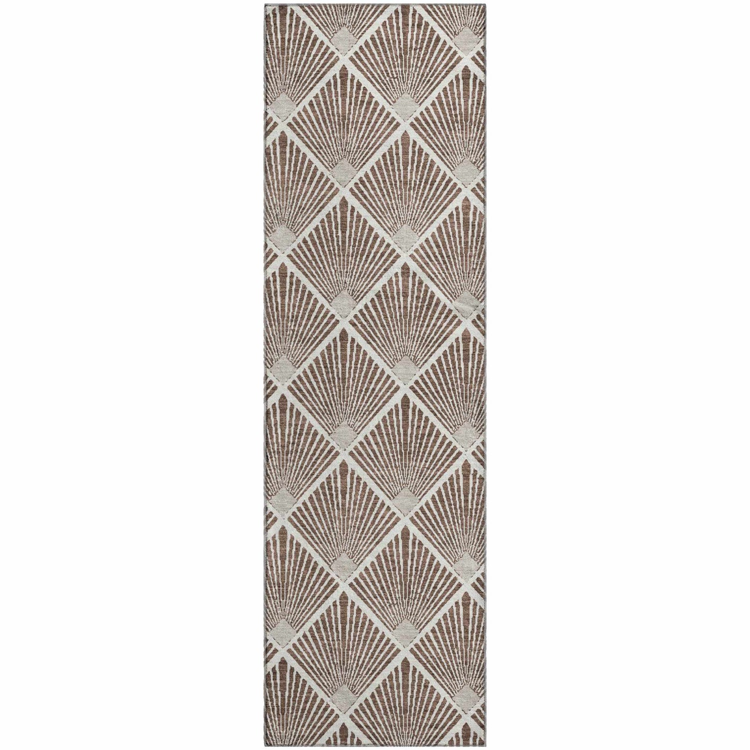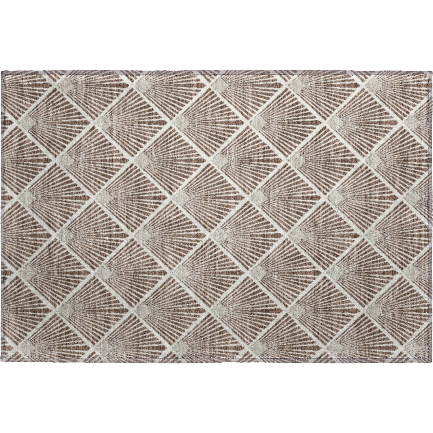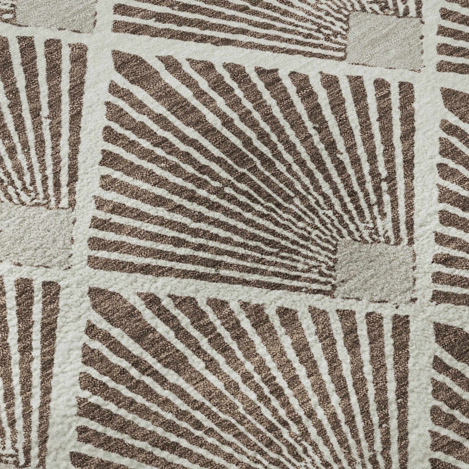 A rectangular area rug with an allover repeating diamond grid pattern. Each diamond is filled with a radiating fan or sunburst texture — thin lines emanating from the bottom point of each diamond outward, creating a feathered, almost Art Deco effect. The dominant color is a warm medium brown, with the diamond outlines and grid lines rendered in cream and light beige. Subtle gray undertones appear within the textured fill of each diamond, adding depth. The surface has a low, smooth pile with a machine-woven appearance. Edges are cleanly bound with no fringe or tassels. The overall impression is of a sophisticated, neutral geometric rug with a handcrafted-looking texture.
