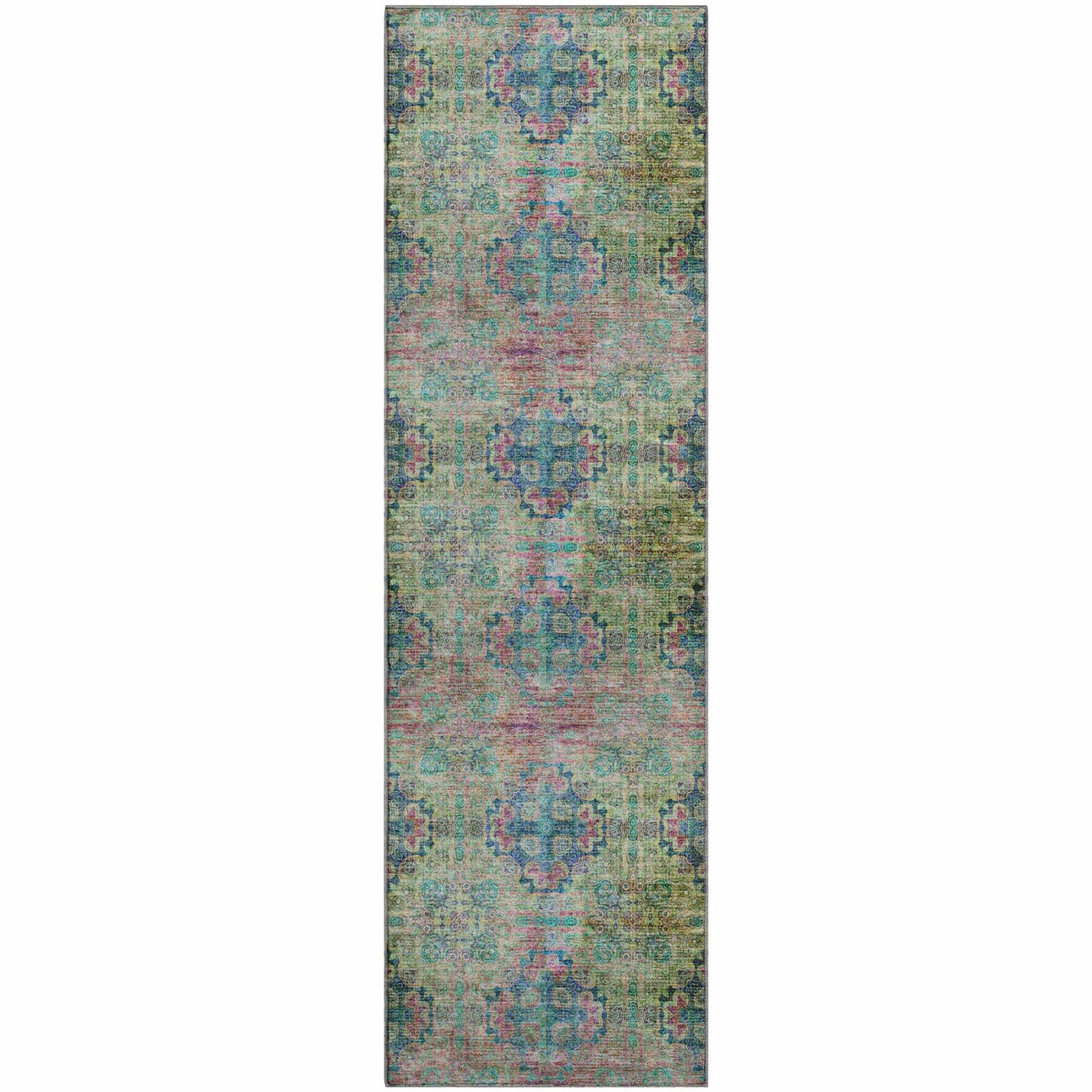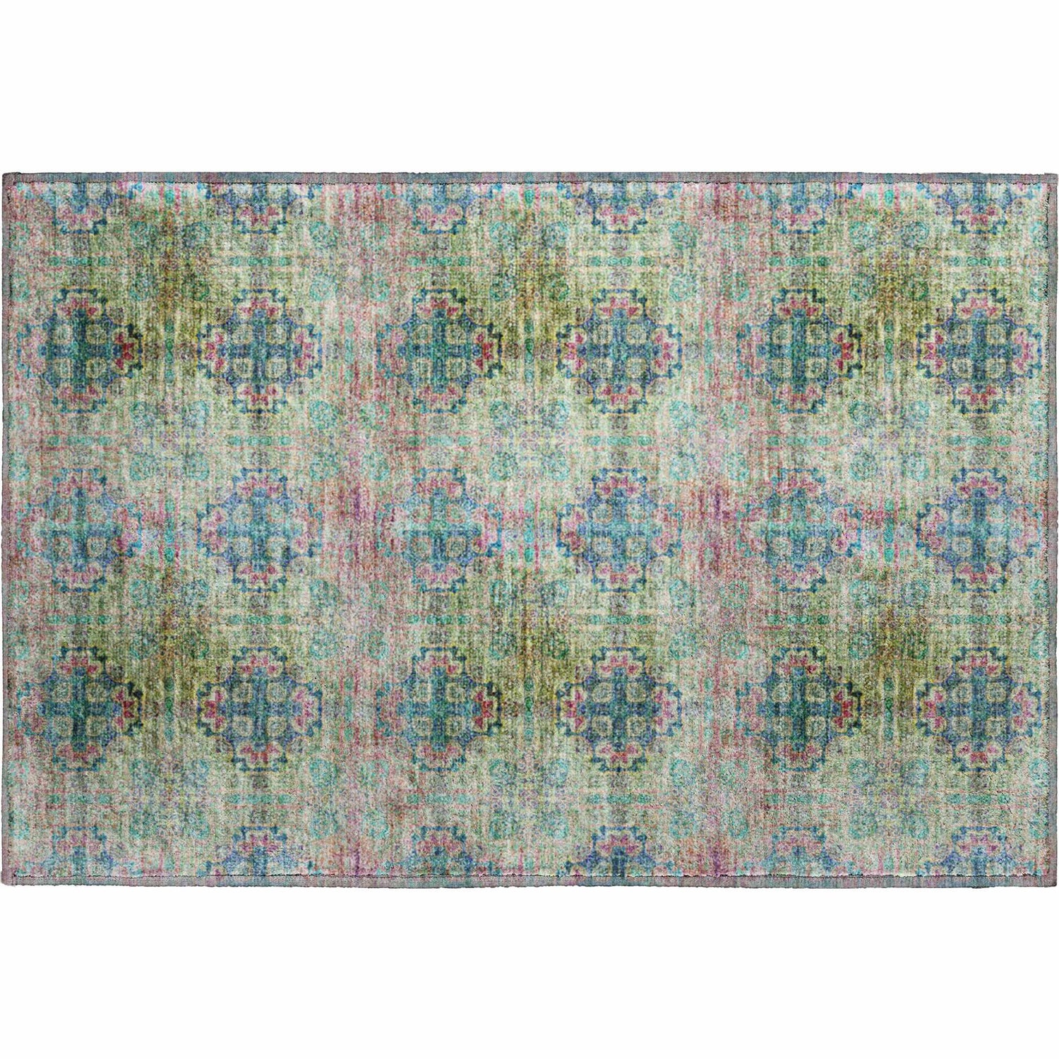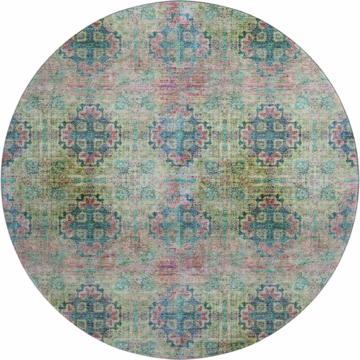 A vibrant, washable medallion rug with a distressed overdyed finish in rich greens, teals, and pinks — works beautifully indoors or out.