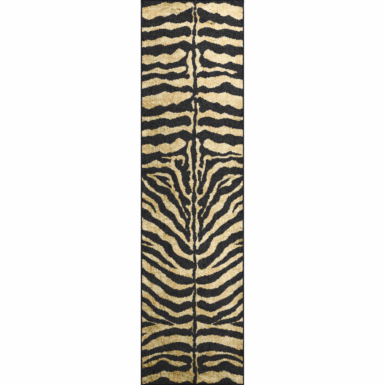 A bold zebra-print statement rug in black and warm gold — and yes, it's machine washable. Thick, plush pile that feels as good as it looks.