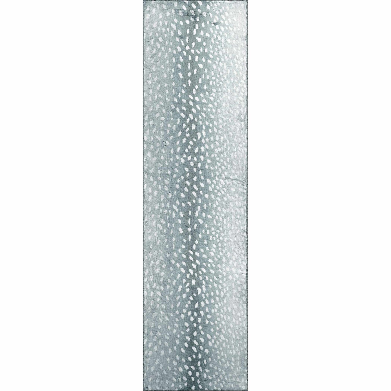 A rectangular high-pile area rug with a cool, misty gray base covering the entire field. Scattered across the surface are irregular, softly-edged white spots of varying sizes — organic in shape, reminiscent of a fawn's coat or abstract watercolor drops, distributed somewhat randomly but with a slight concentration toward the center. The pile is visibly thick and plush, giving the surface a velvety, slightly textured appearance. The edges are cleanly bound with a thin gray border. The overall impression is of a soft, modern, understated rug with a quiet organic pattern that reads as both contemporary and nature-inspired.