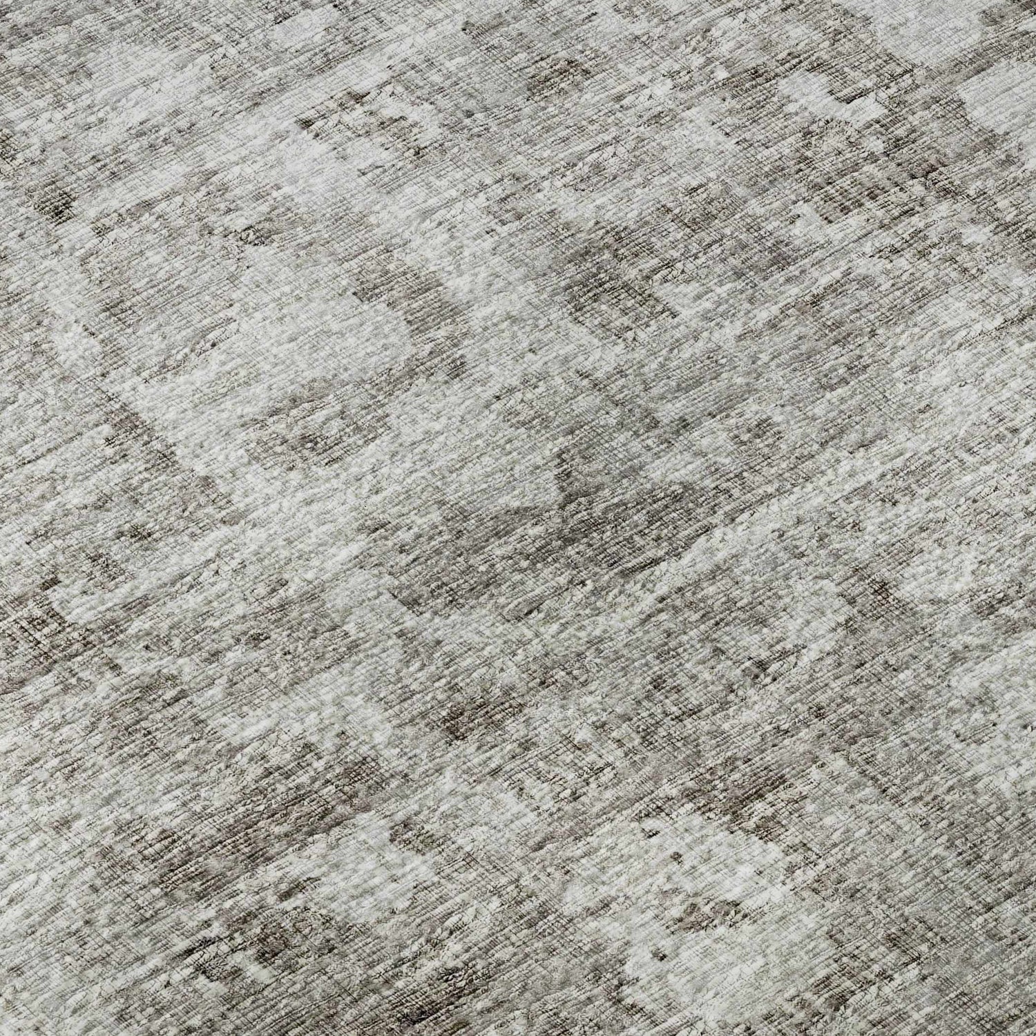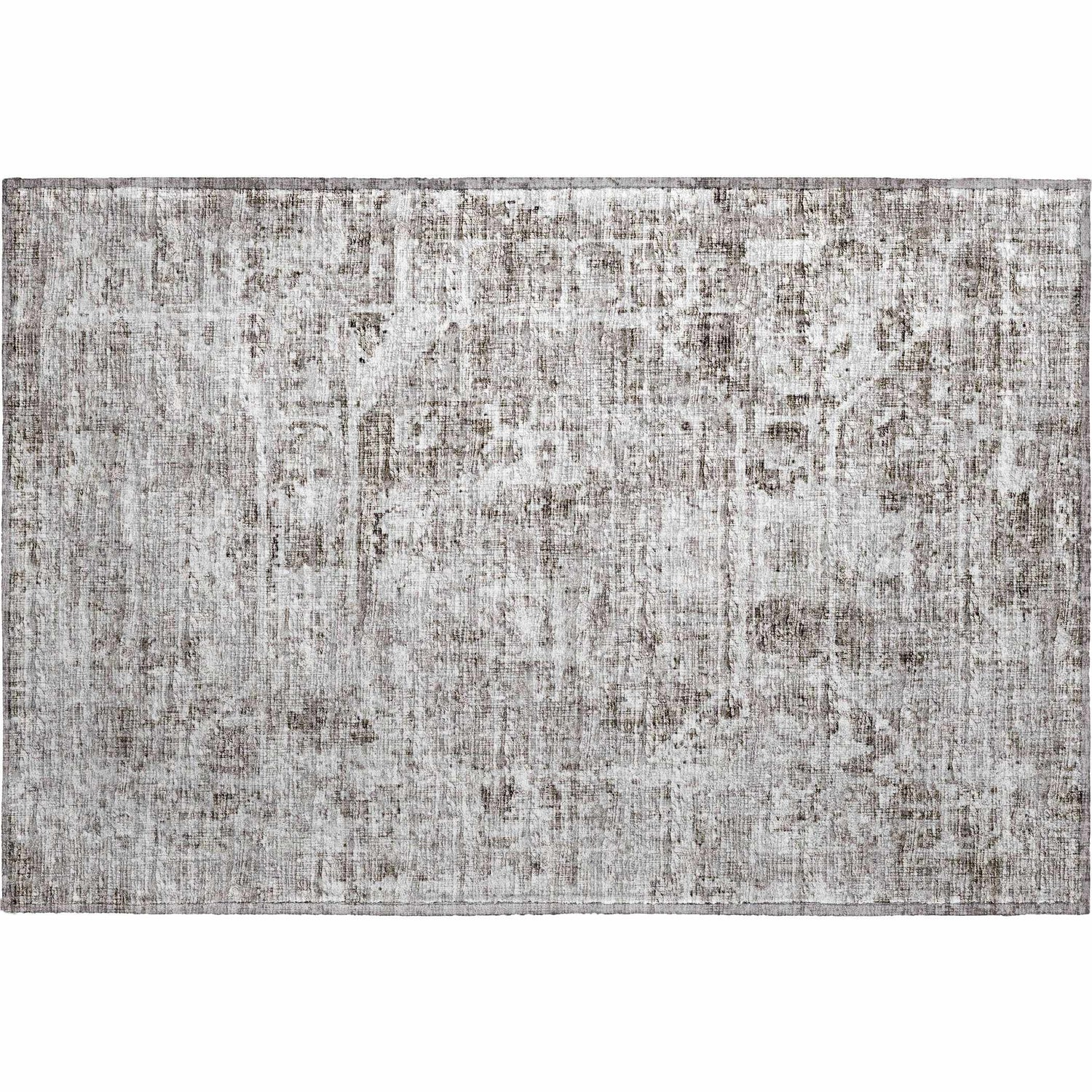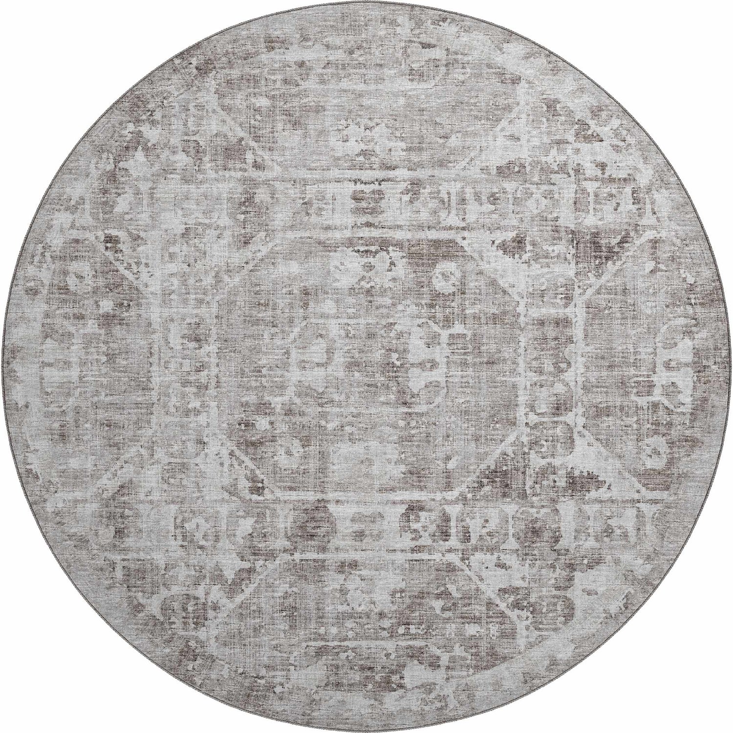 A faded, vintage-inspired gray and brown rug that's fully machine washable and outdoor-safe — beautiful style that actually handles real life.