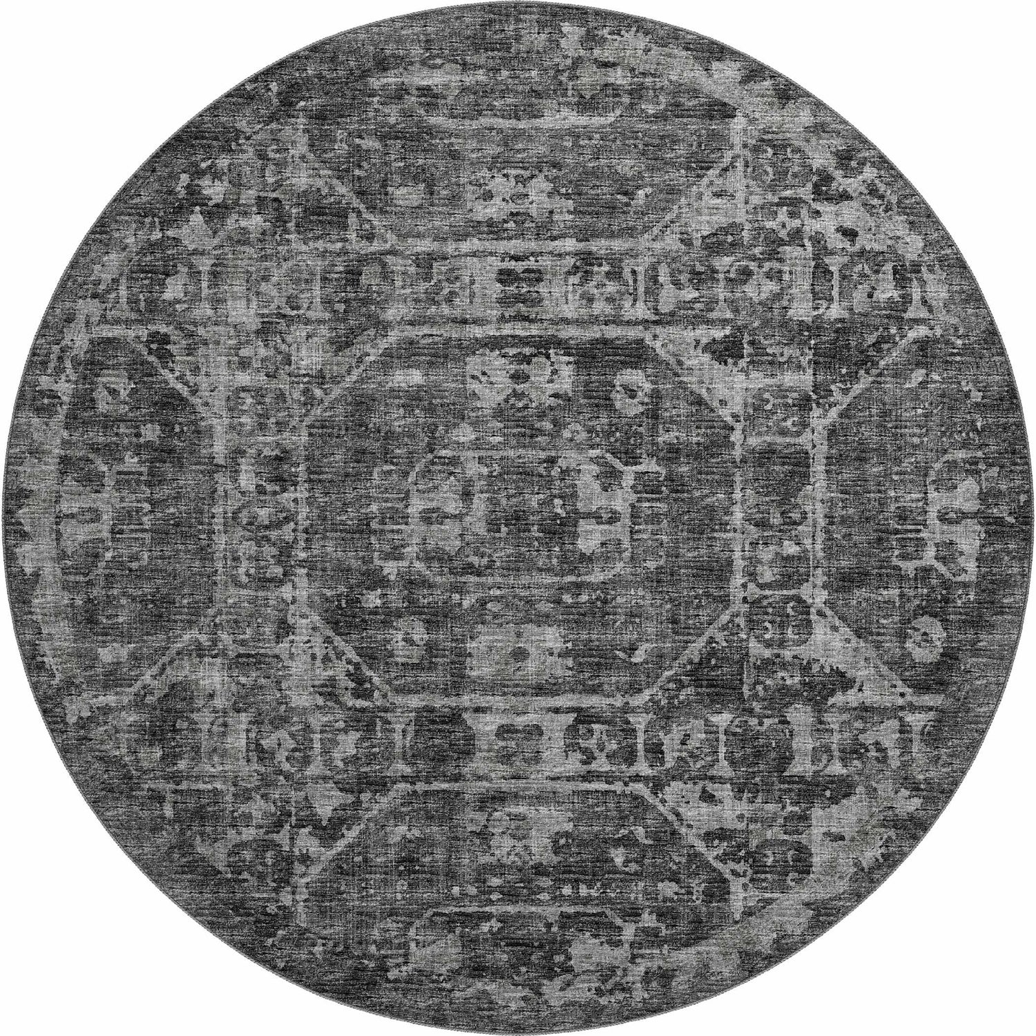 cool paletteA deep, moody black dominates the surface, layered with faded charcoal and silver-gray tones that create the illusion of age and wear — like a treasured antique rug that's been beautifully lived in.