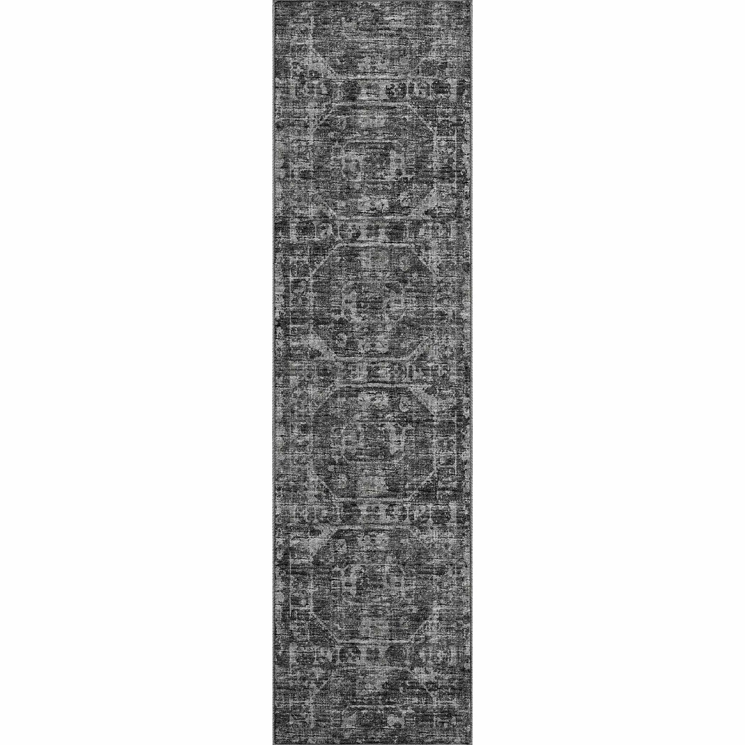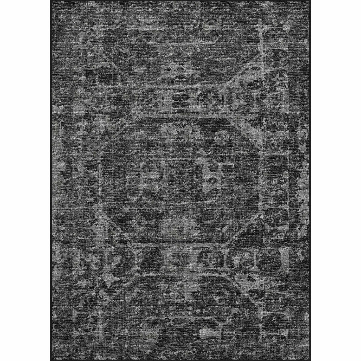 A dramatic black distressed Persian rug that's actually machine washable and outdoor safe — bold style meets zero-compromise practicality.