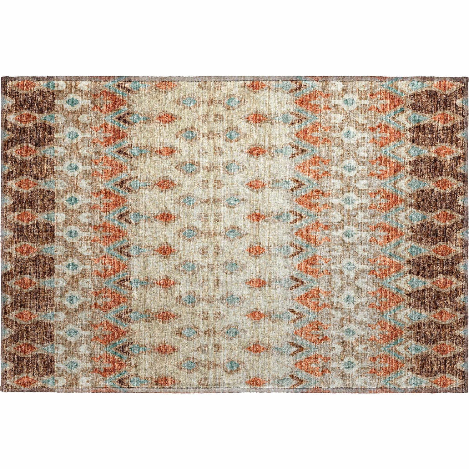 A rectangular area rug featuring a bold ikat-inspired tribal pattern with repeating diamond and chevron-like motifs arranged in vertical columns along both sides of the rug. The border areas are rich in mocha brown, terracotta orange, rust, and teal, while the center fades to a soft sandy beige and cream, creating a natural ombre effect. The pattern has a slightly distressed, faded quality as if sun-washed over time, giving it a vintage character. The pile is medium height with a smooth machine-woven surface texture. Edges are cleanly bound with no fringe or tassels. The overall impression is warm, earthy, and globally inspired — like a well-traveled kilim rendered in soft, livable tones.