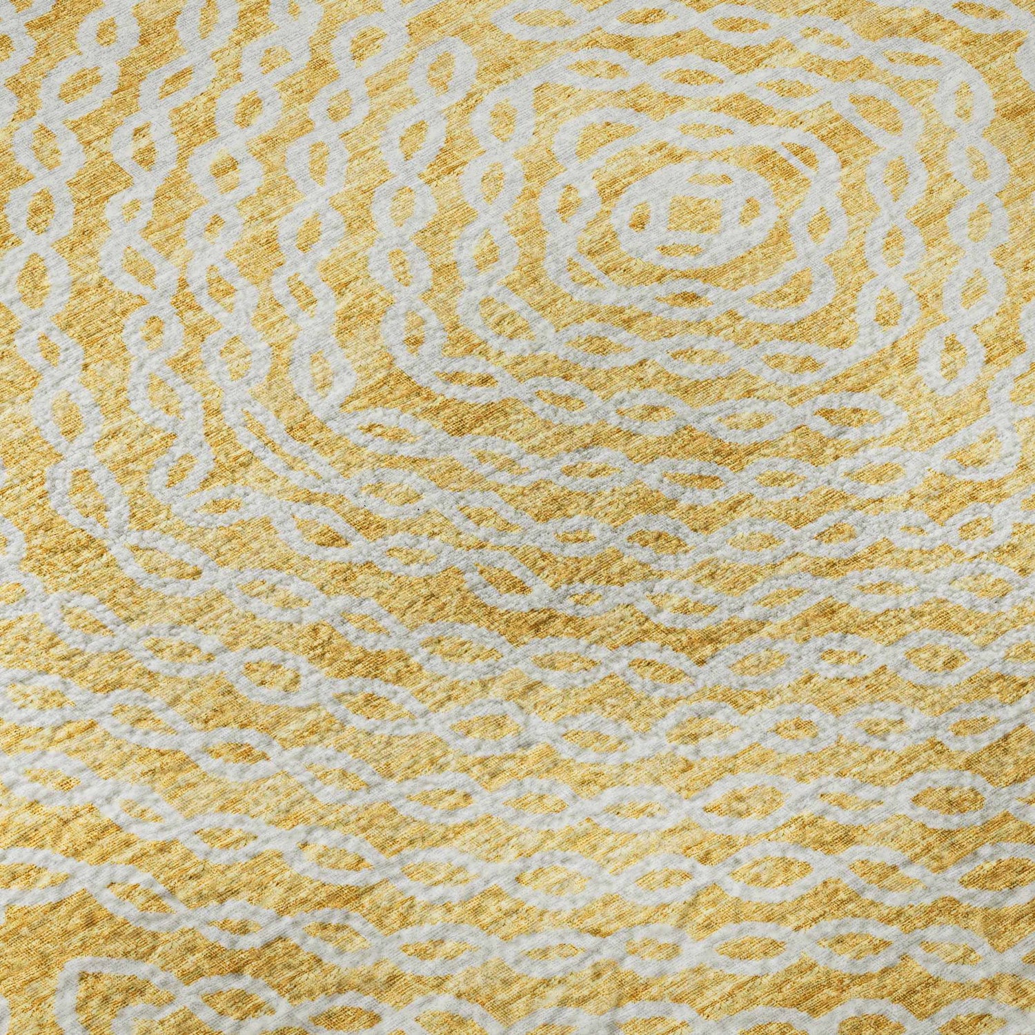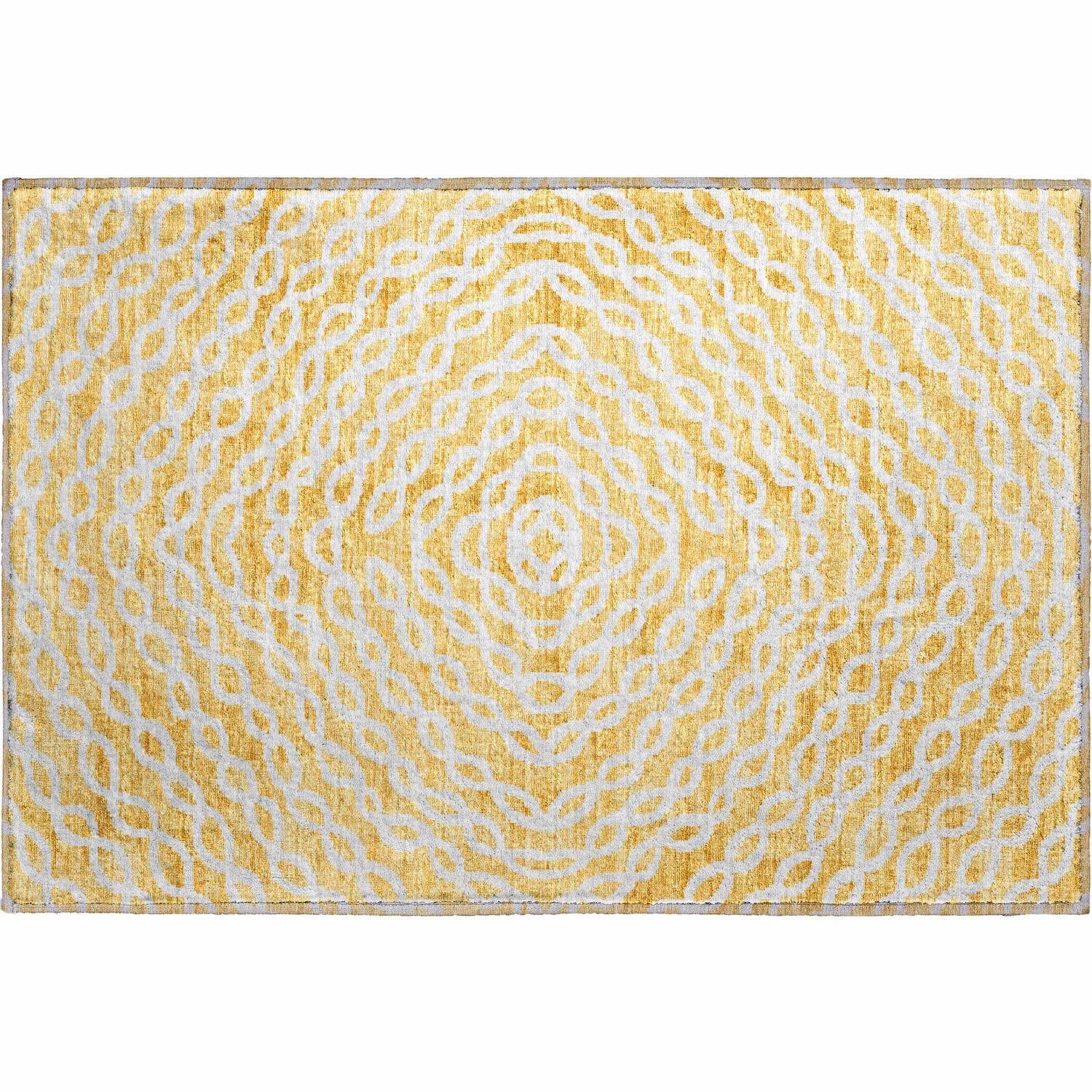 A bold mustard-yellow rug with a mesmerizing white concentric geometric pattern — fully washable, rubber-backed, and ready for indoor or outdoor use.