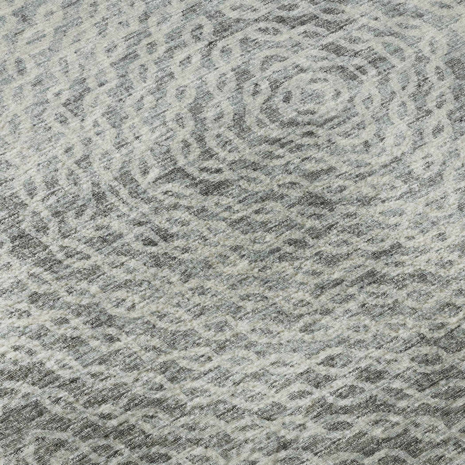 A mesmerizing ripple-medallion geometric in cool gray and white — fully machine washable, rubber-backed, and tough enough for indoors or out.
