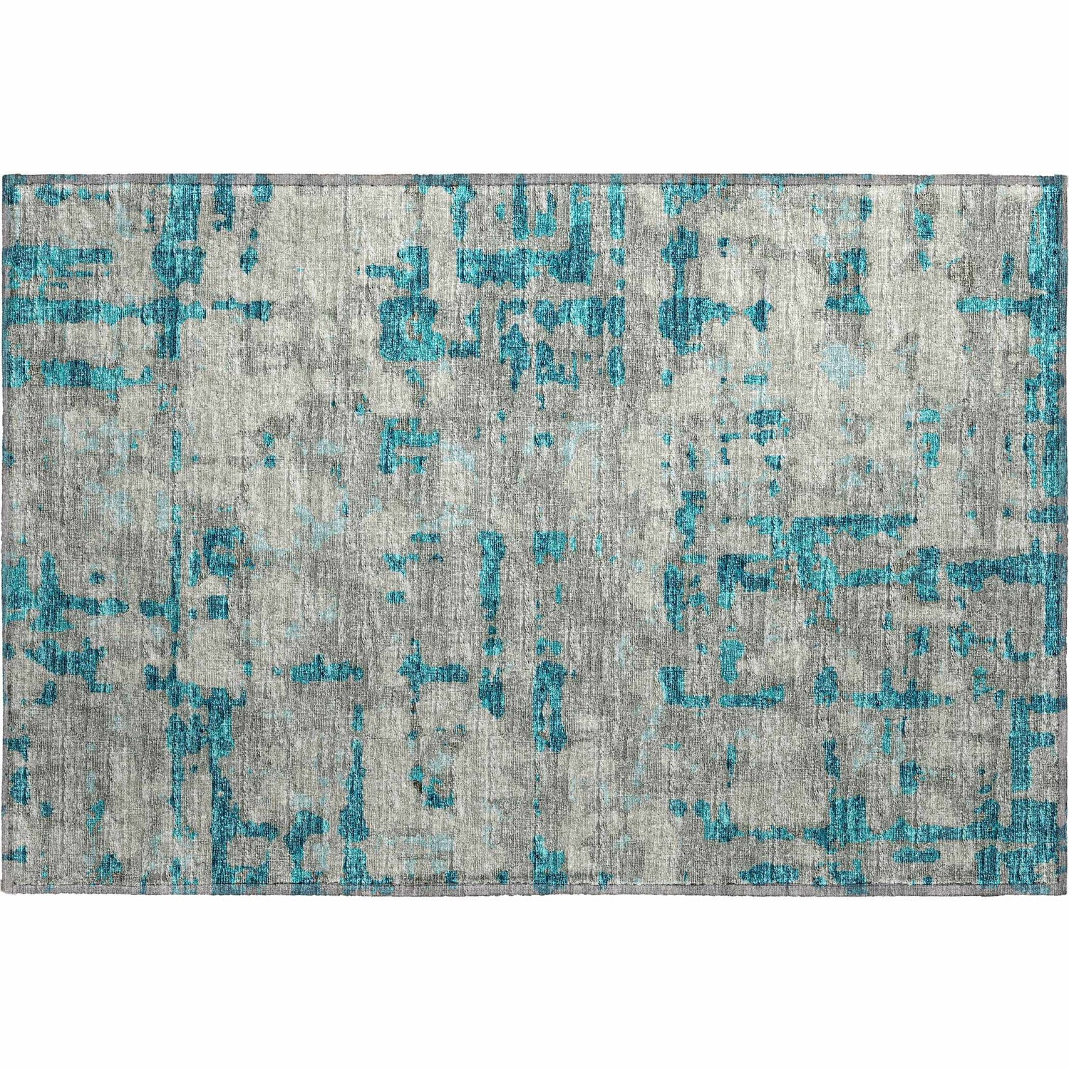 A rectangular area rug with a cool medium gray base and a bold allover abstract pattern rendered in vivid teal. The teal appears in irregular, channel-like shapes and brushstroke-style marks distributed across the entire surface — not a repeating geometric, but an organic, painterly layout that gives the rug a distressed, almost overdyed quality. The teal and gray blend at the edges of each shape, creating a slightly worn, faded effect. The pile is low and smooth with a subtle machine-woven texture visible across the surface. Edges are cleanly bound with no fringe or tassels. Overall impression: bold, modern, and graphic — like an abstract painting translated into a rug.