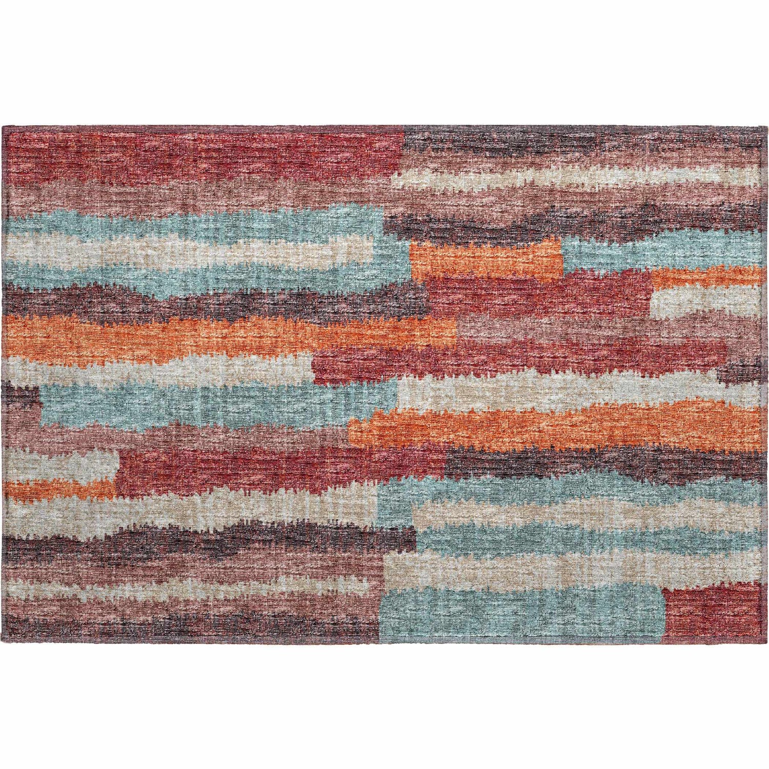 A rectangular area rug featuring an abstract horizontal brushstroke pattern in a rich multicolor palette. The design consists of irregular, painterly bands of color — deep red, vivid teal, burnt orange, warm gray, burgundy, and soft beige — layered across the rug in a broken, overlapping stripe arrangement that mimics the look of gestural brushwork. The colors bleed and blend at the edges, giving the pattern an organic, slightly distressed quality. The pile is low and smooth with a subtle woven texture visible across the surface. Edges are cleanly bound with no fringe or tassels. The overall impression is bold and expressive — like an abstract watercolor painting rendered in textile form.