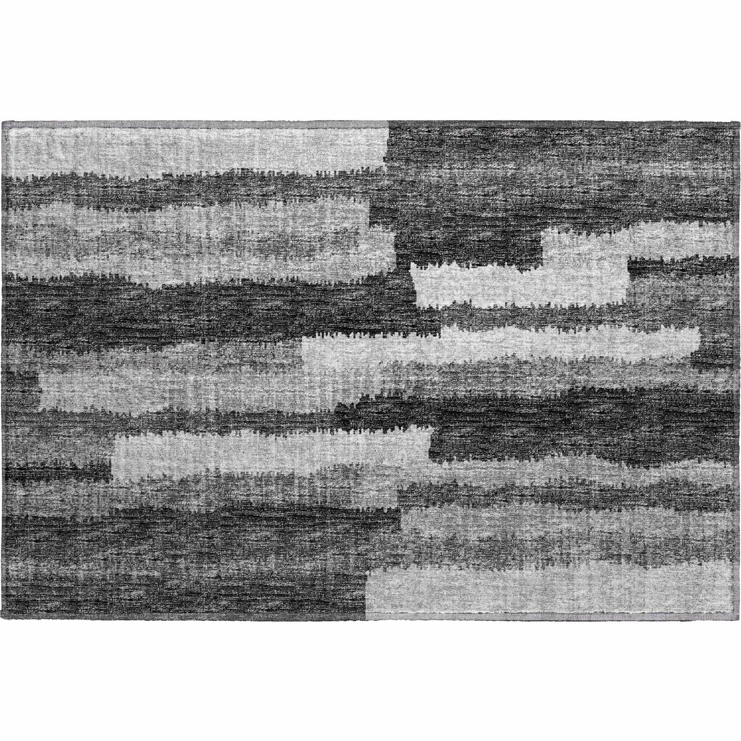 A rectangular area rug with a bold abstract horizontal brushstroke pattern. The dominant color is deep charcoal black, covering roughly half the surface, with sweeping irregular bands of medium gray and bright light gray-white cutting across the rug horizontally in an organic, painterly fashion. The bands vary in width and edge definition — some crisp, some feathered — creating a layered, almost watercolor-like effect. The texture appears smooth and low-profile with a tight machine-woven surface and subtle visible weave texture. Edges are cleanly bound with no fringe or tassels. The overall impression is graphic, modern, and dramatic — like an abstract ink painting rendered in rug form.