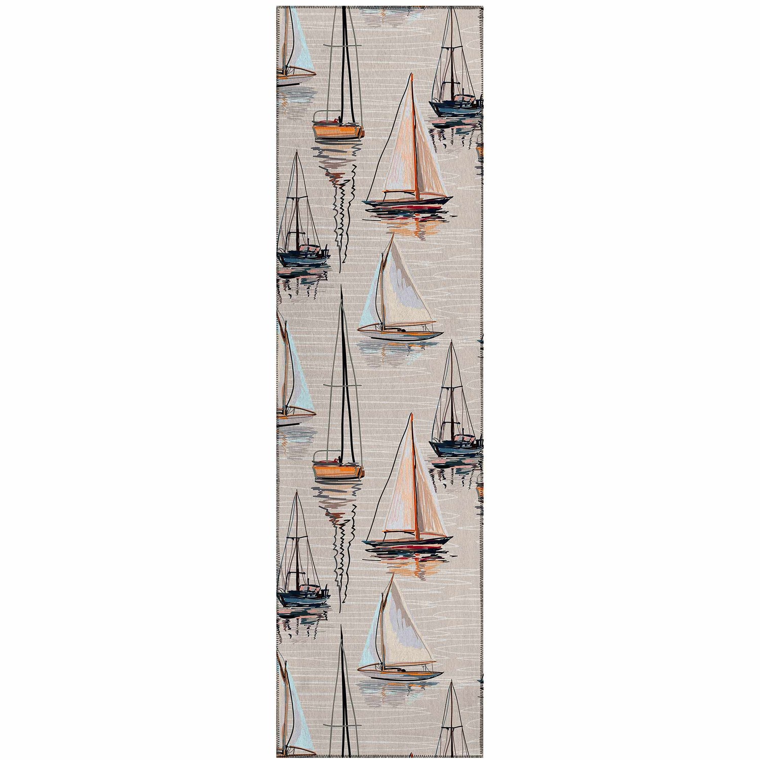 neutral paletteA soft ivory and warm beige base sets a calm, sun-washed tone, with sailboats rendered in creamy white, muted navy, dusty blue, and golden yellow — the overall palette feels like a hazy afternoon on the water.