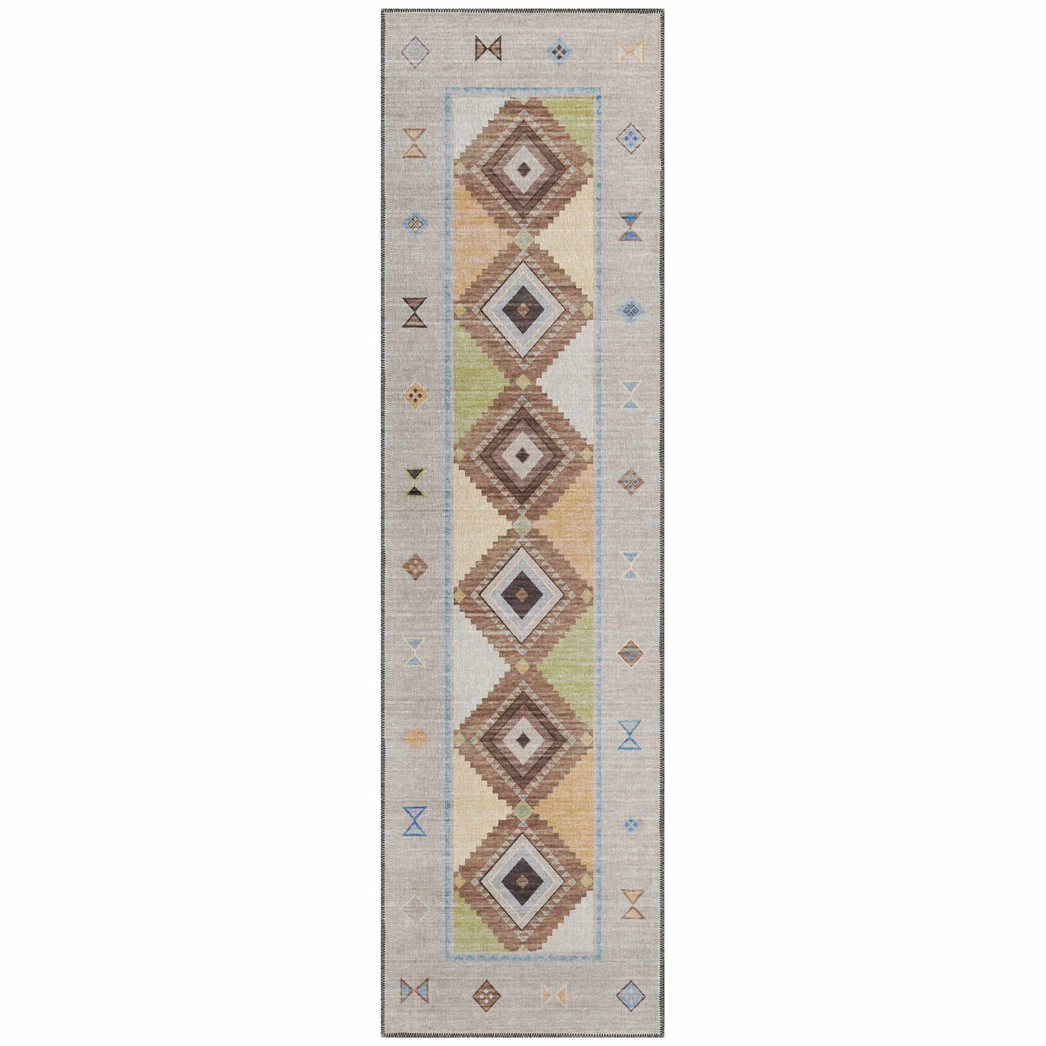 A rectangular low-pile area rug with a warm sandy taupe ground and a bold dual diamond medallion composition as the central design. Two large nested diamond shapes dominate the center field — each built from layered geometric chevron-like bands in warm brown, with cream and off-white innermost diamonds. The surrounding field features soft sage green washes and golden yellow tones. A structured decorative border frames the rug with small geometric motifs — arrows, diamonds, and hourglass shapes — in brown, blue, and green on a light beige ground. A thin light blue inner border line separates the field from the outer border. The edges are finished with a tight overlock stitch in gray. The surface is smooth and flat with a machine-woven texture, no fringe or tassels. Overall impression: a soft, earthy southwestern tribal rug with a relaxed, sun-warmed palette.
