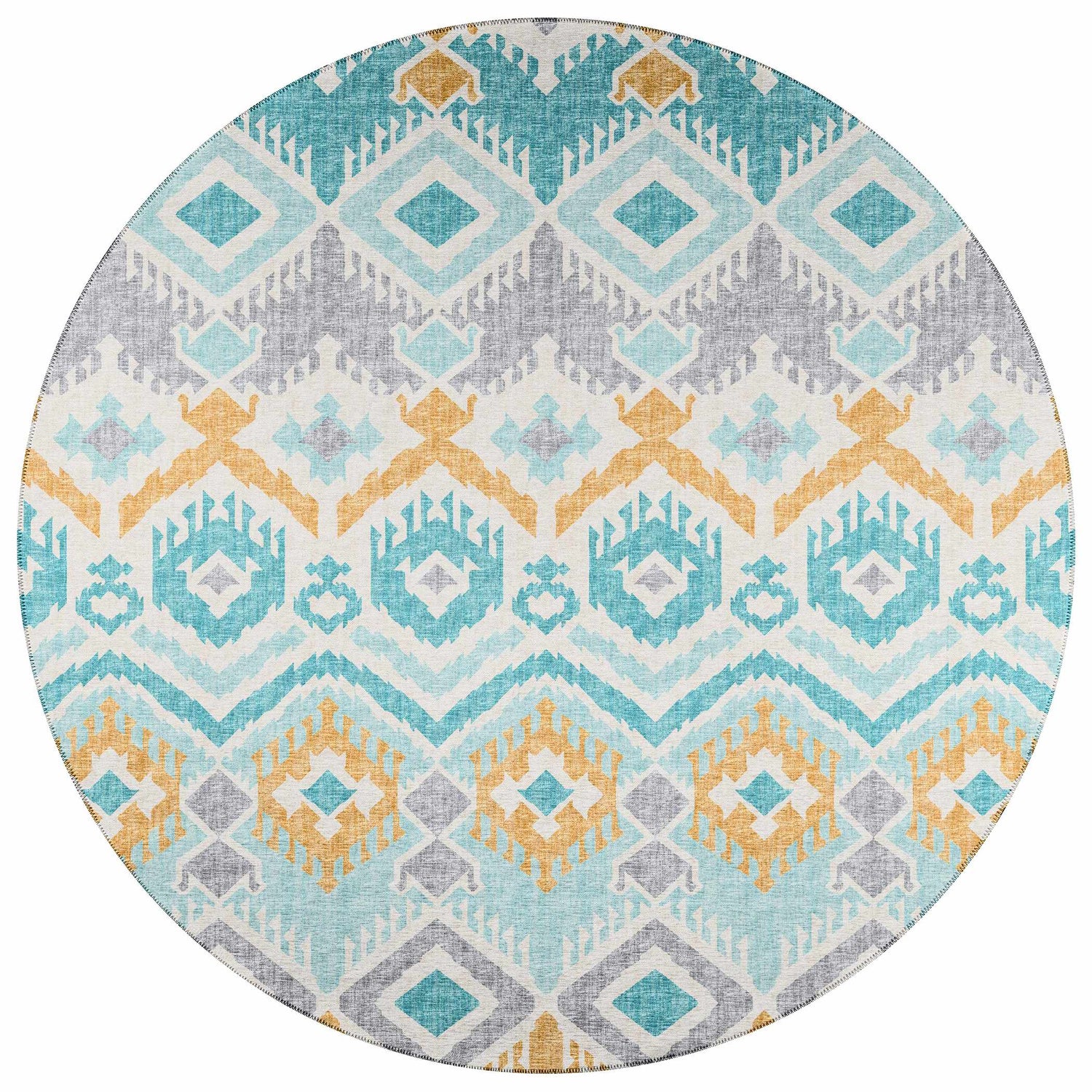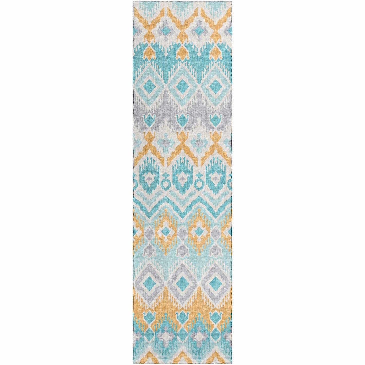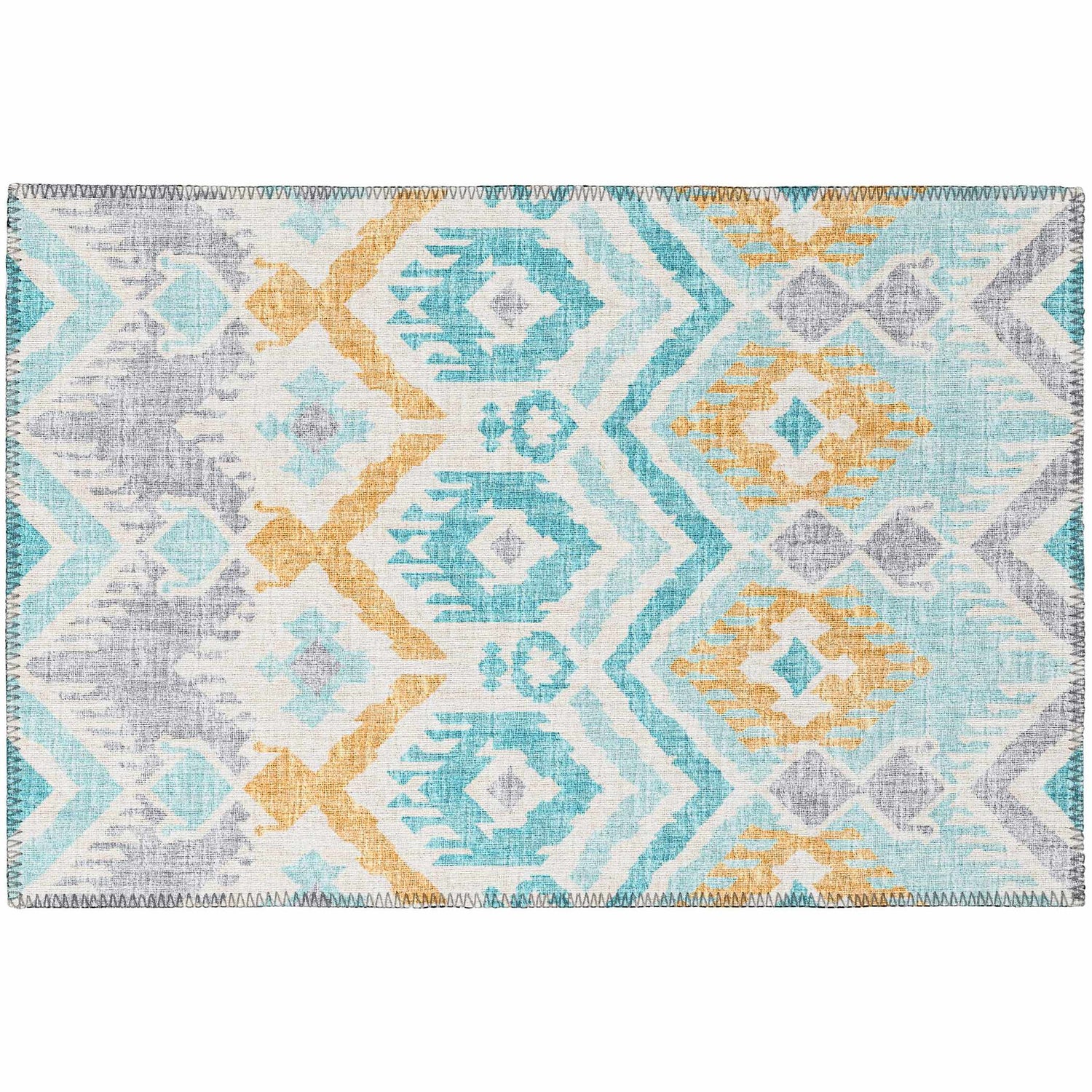 A vibrant teal and mustard ikat tribal rug that's fully machine washable and outdoor safe — bold global style with zero-stress cleanup.