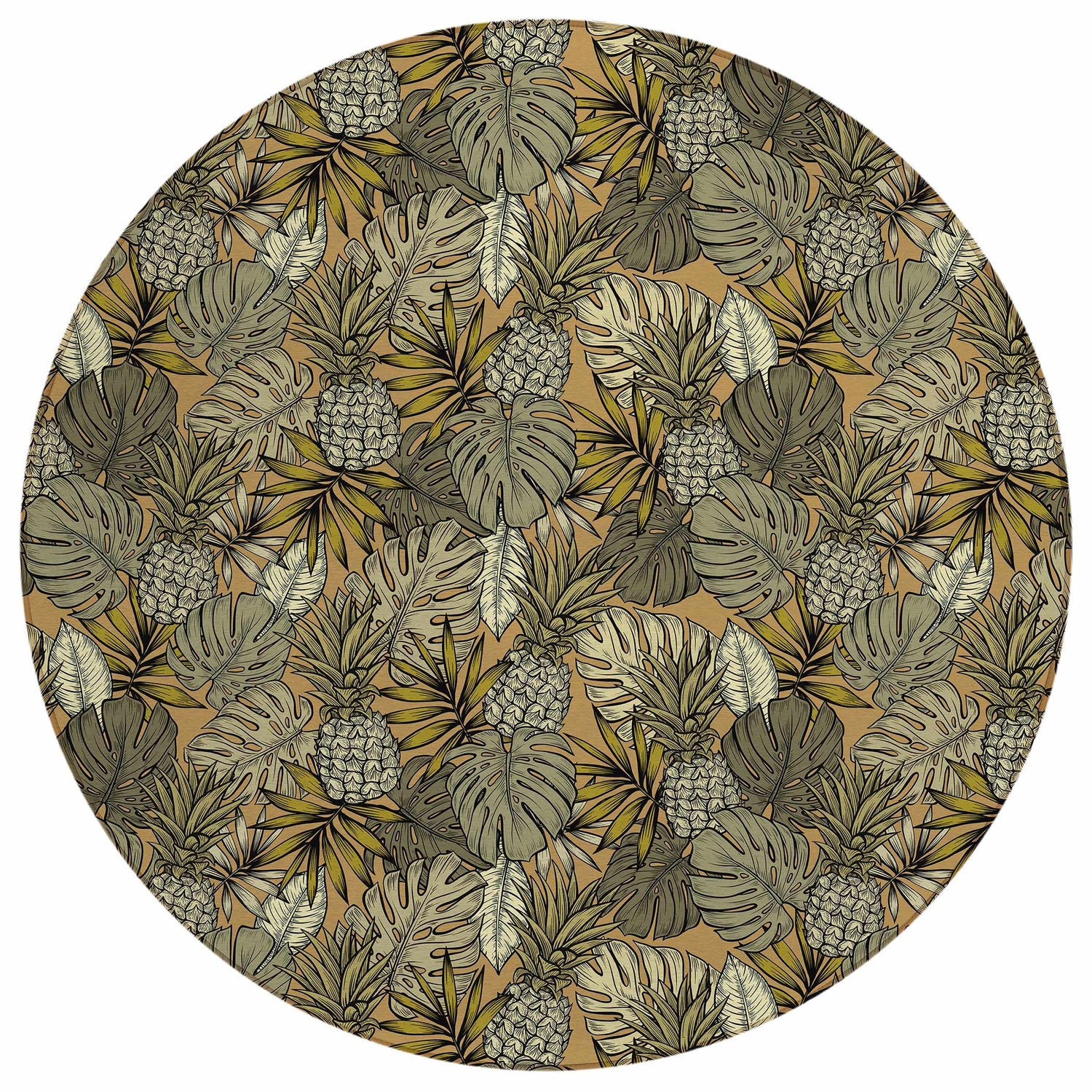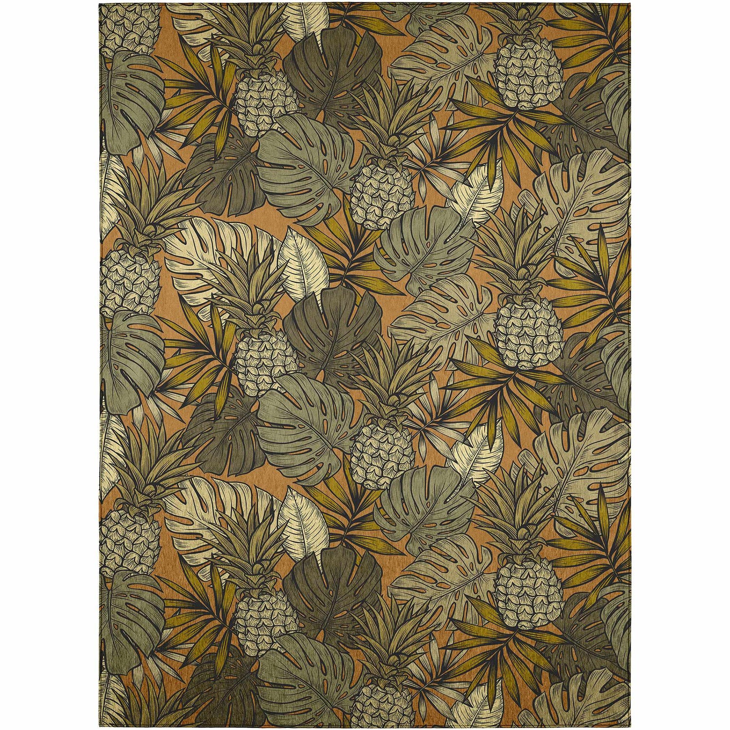 Lush monstera leaves, pineapples, and palm fronds in earthy greens and mustard gold — this washable, outdoor-safe rug brings tropical energy to any space.