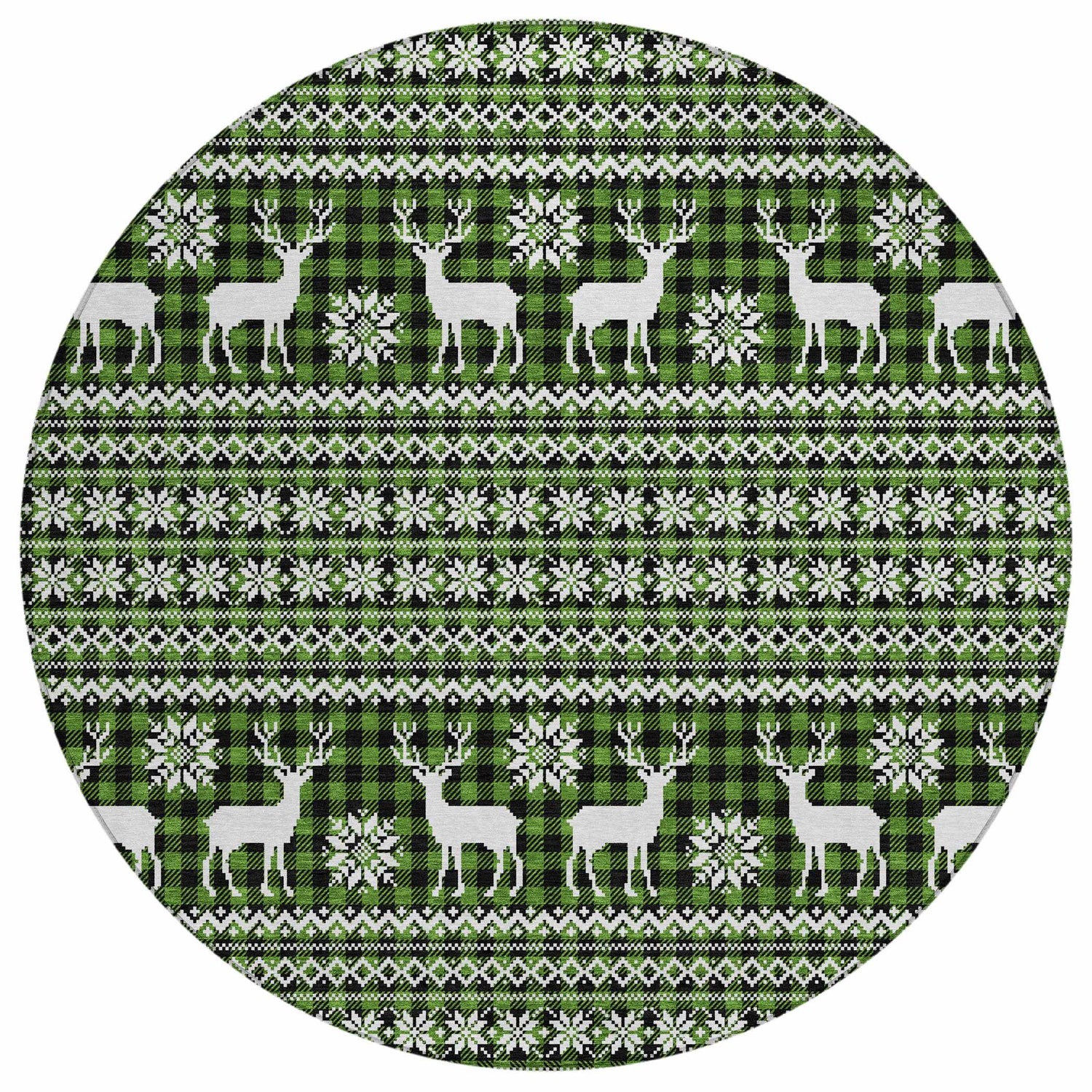 A deep forest green and black buffalo plaid forms the bold base, with crisp white reindeer and snowflake motifs standing out in sharp contrast — the overall palette feels like a classic holiday sweater brought to life underfoot.