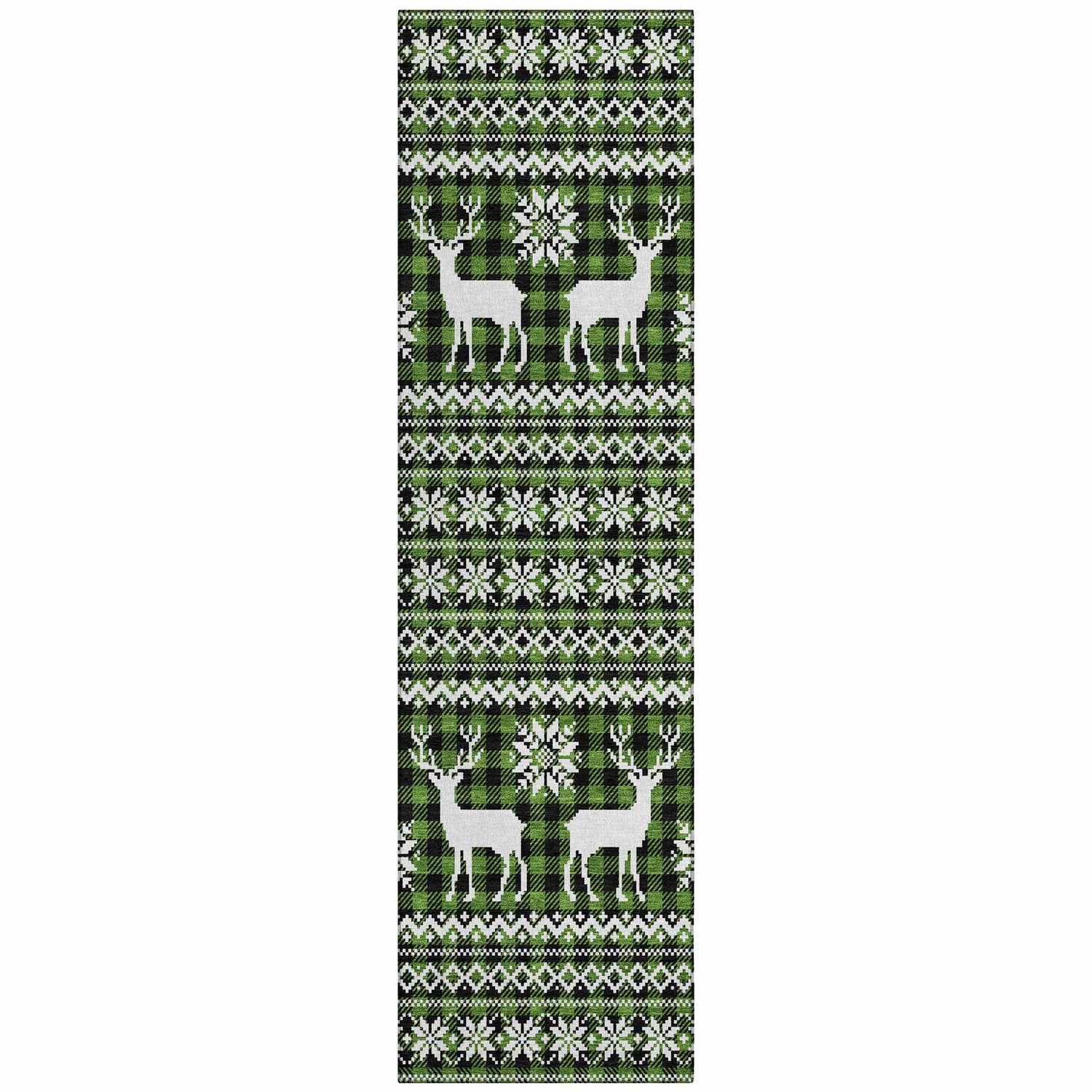 A rectangular, low-pile area rug with a bold green and black buffalo plaid base pattern running vertically across the entire surface. Overlaid on the plaid are horizontal bands featuring large white reindeer silhouettes in a leaping pose, alternating with rows of intricate white Nordic snowflake and diamond geometric borders. The contrast between the deep green-black plaid and the crisp white motifs is sharp and graphic. The surface texture appears smooth and tightly woven with minimal pile height, giving it a flat, printed-sweater-like appearance. Edges are cleanly bound with no fringe or tassels.