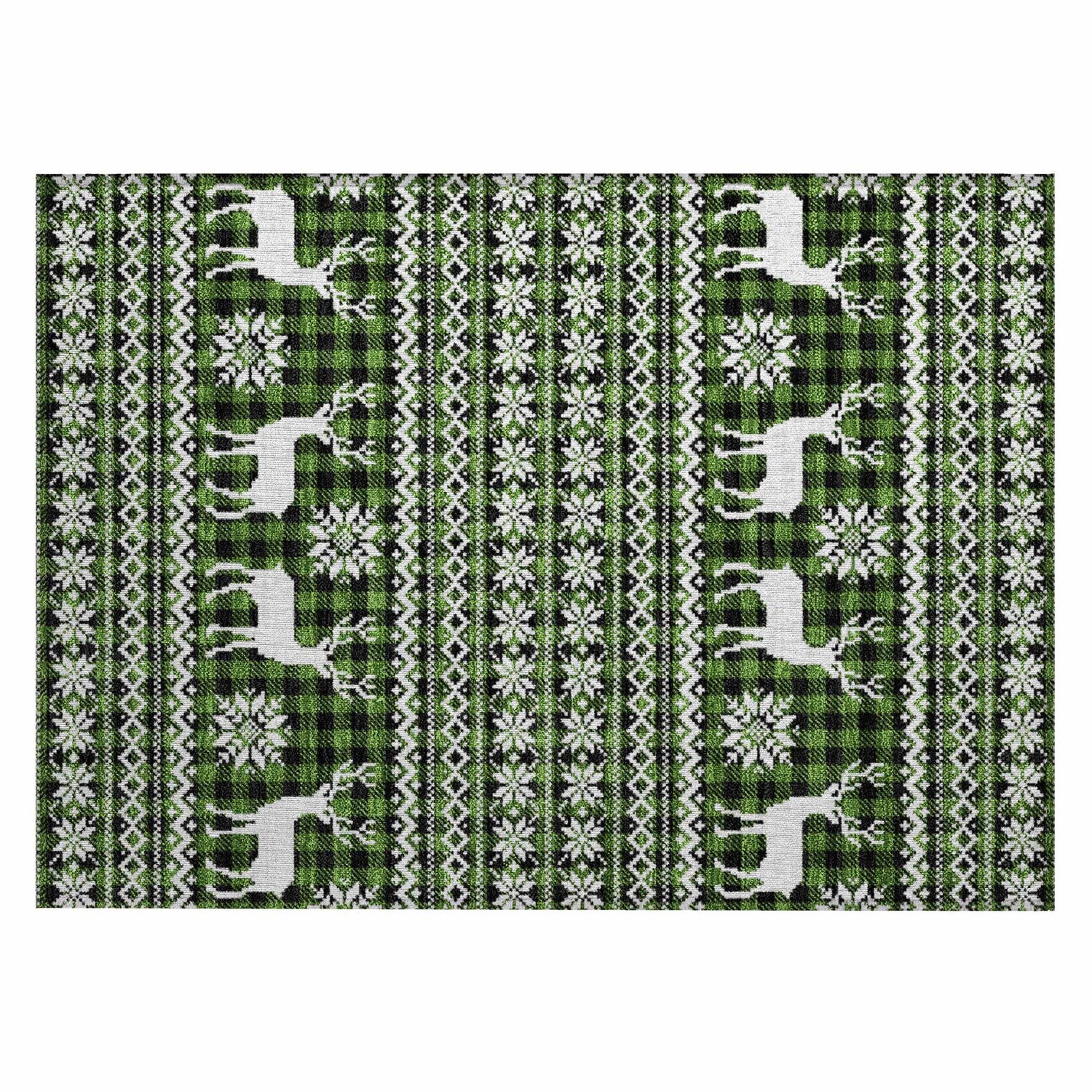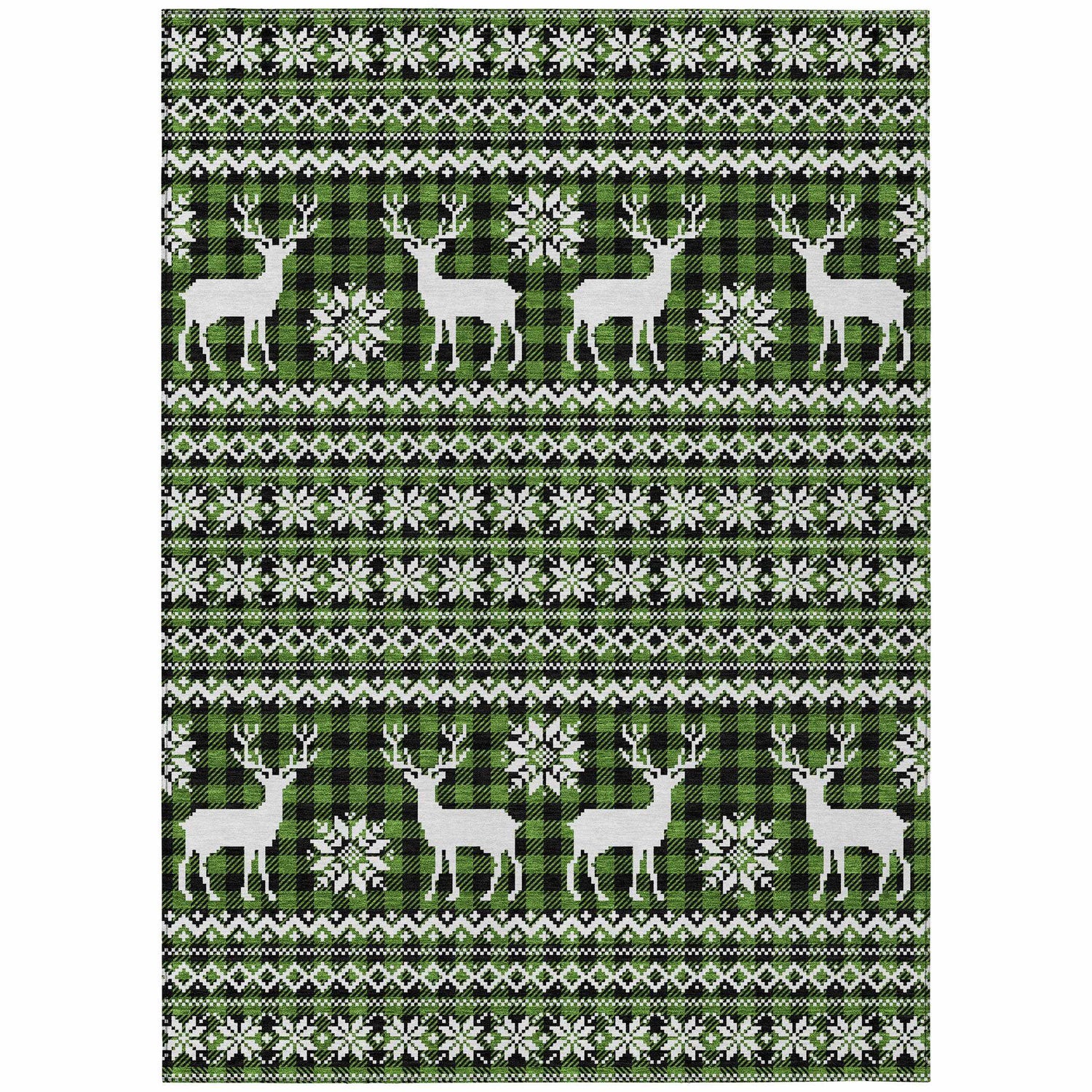 Bold green buffalo plaid meets white reindeer and snowflake borders in this washable, outdoor-safe holiday rug — festive style that's built to handle real life.