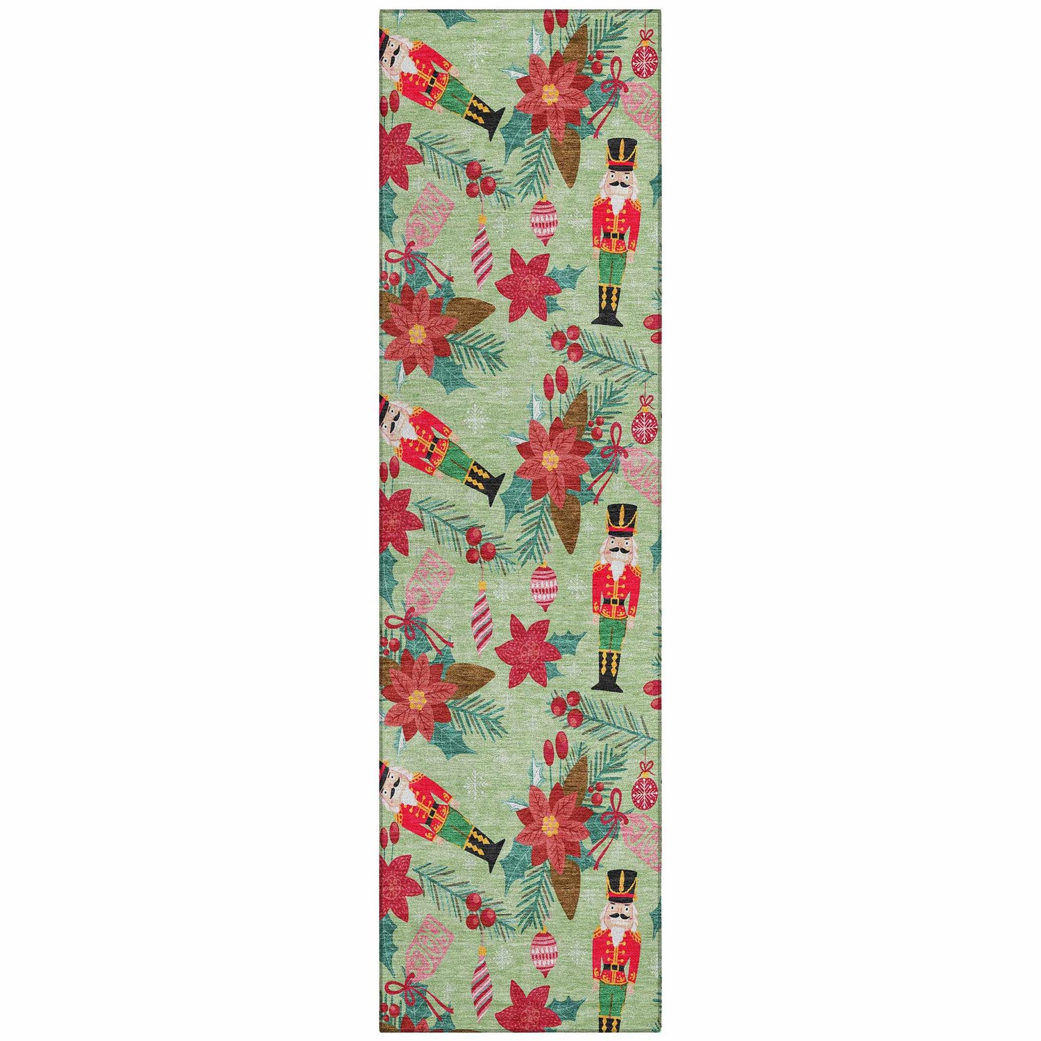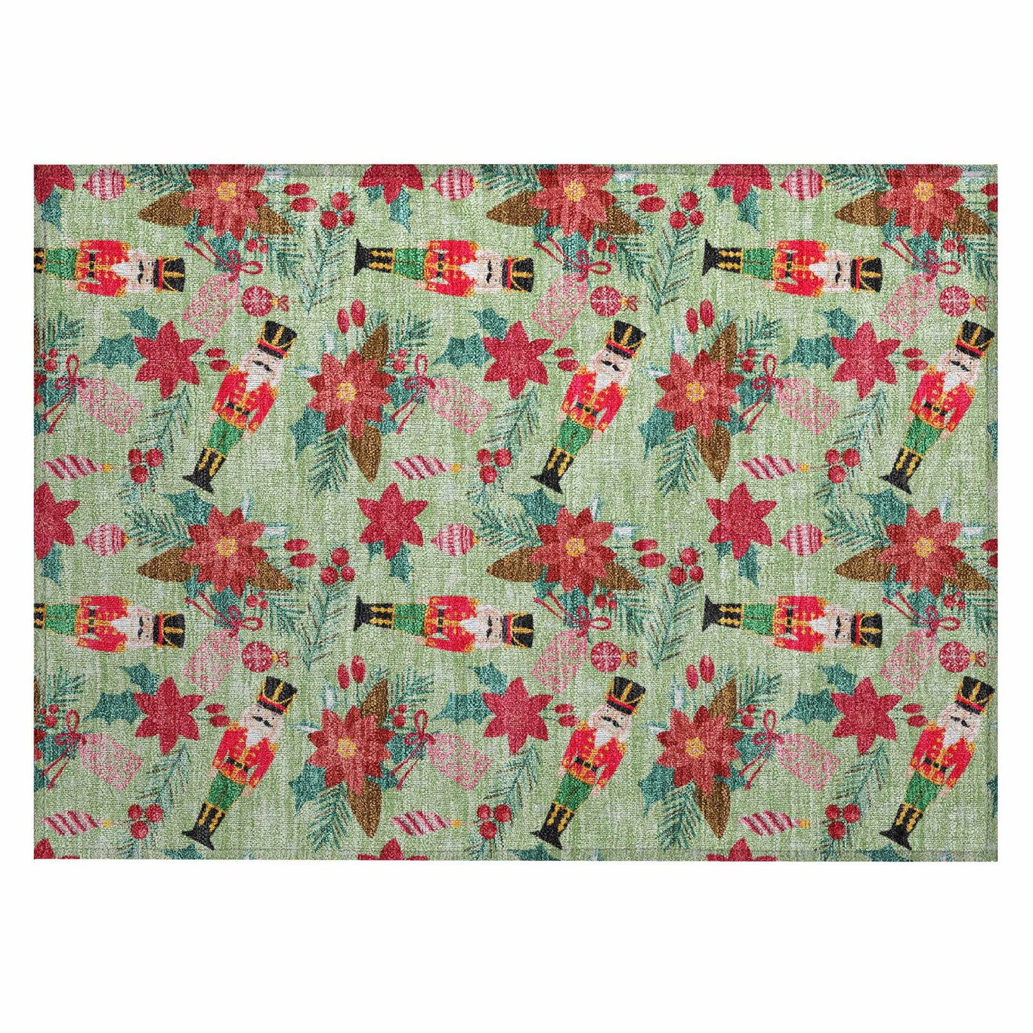 Festive nutcrackers, poinsettias, and holly dance across a sage green background — this washable, outdoor-safe holiday rug is as practical as it is merry.
