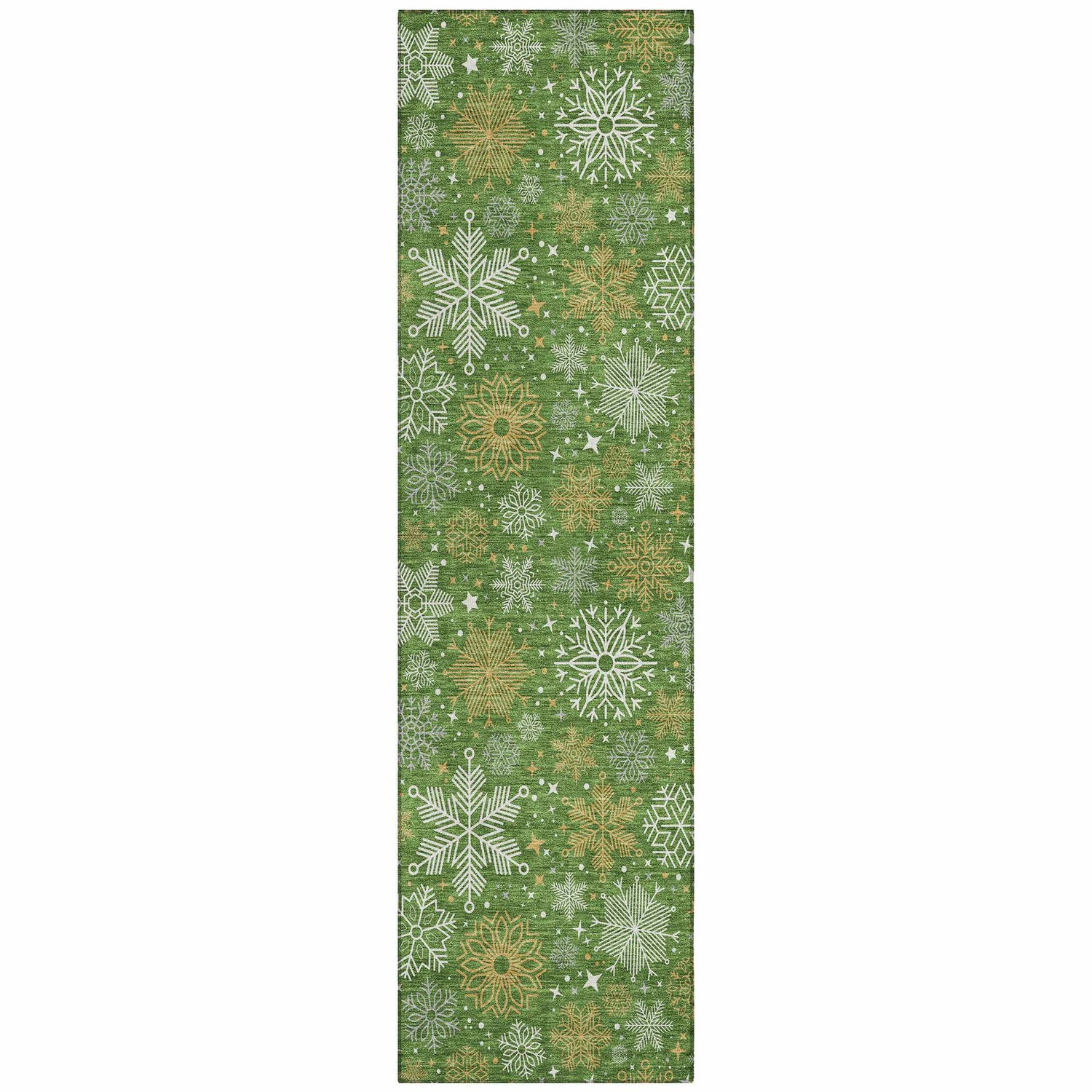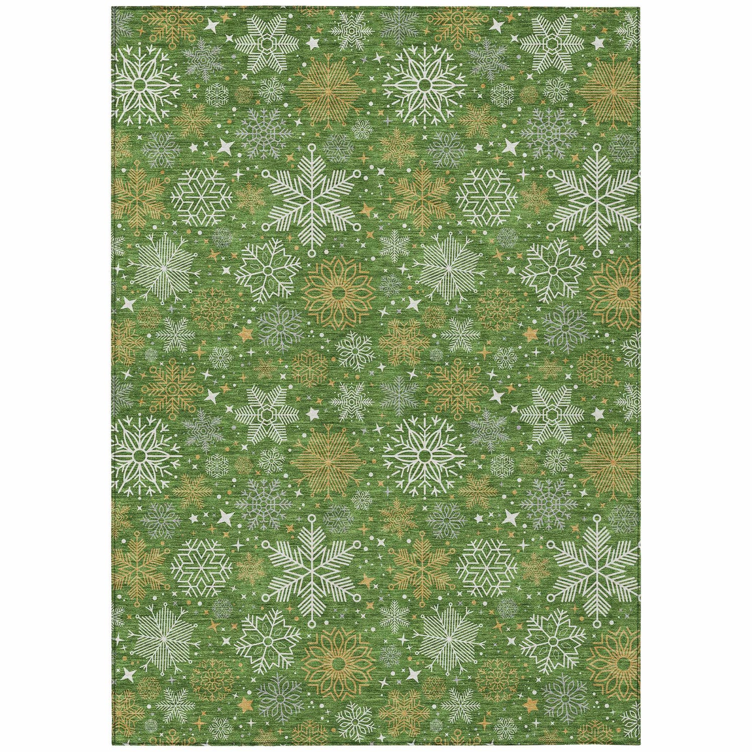 A festive forest green rug blanketed in white and gold snowflakes — fully washable, outdoor safe, and rubber-backed for the holidays and beyond.