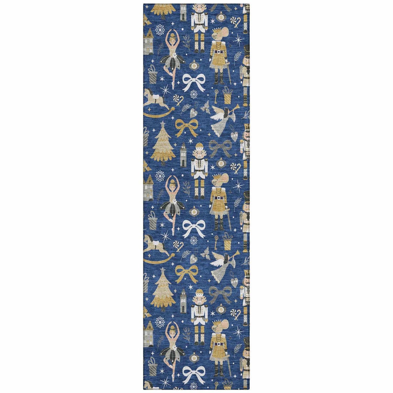 A sophisticated navy blue holiday rug featuring Nutcracker motifs in gold, white, and silver — machine washable, outdoor-safe, and rubber-backed for worry-free festive decorating.