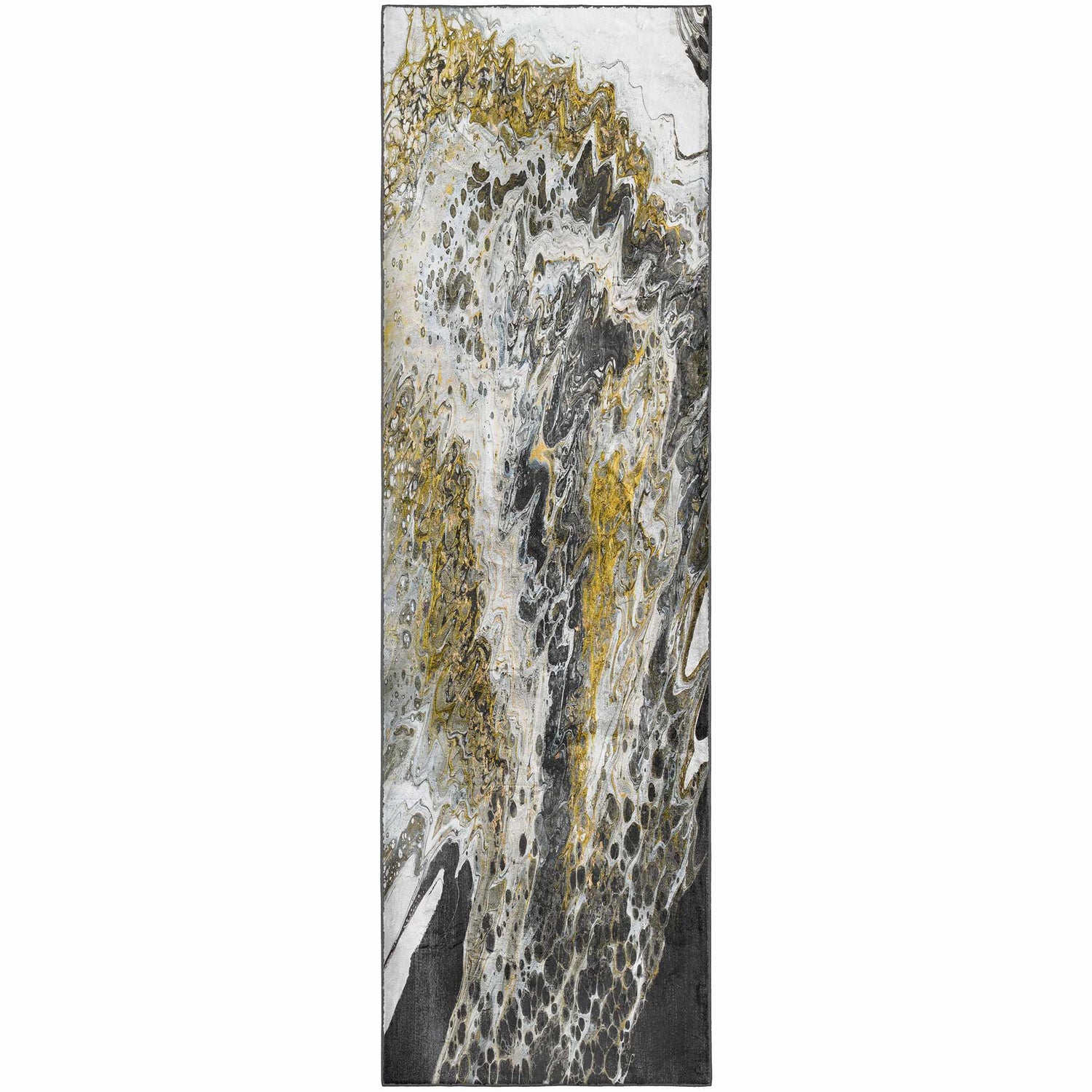 Bold abstract marble swirls in graphite, black, and gold — this plush, machine-washable Dalyn Kikiamo rug brings gallery-worthy drama to any modern space.
