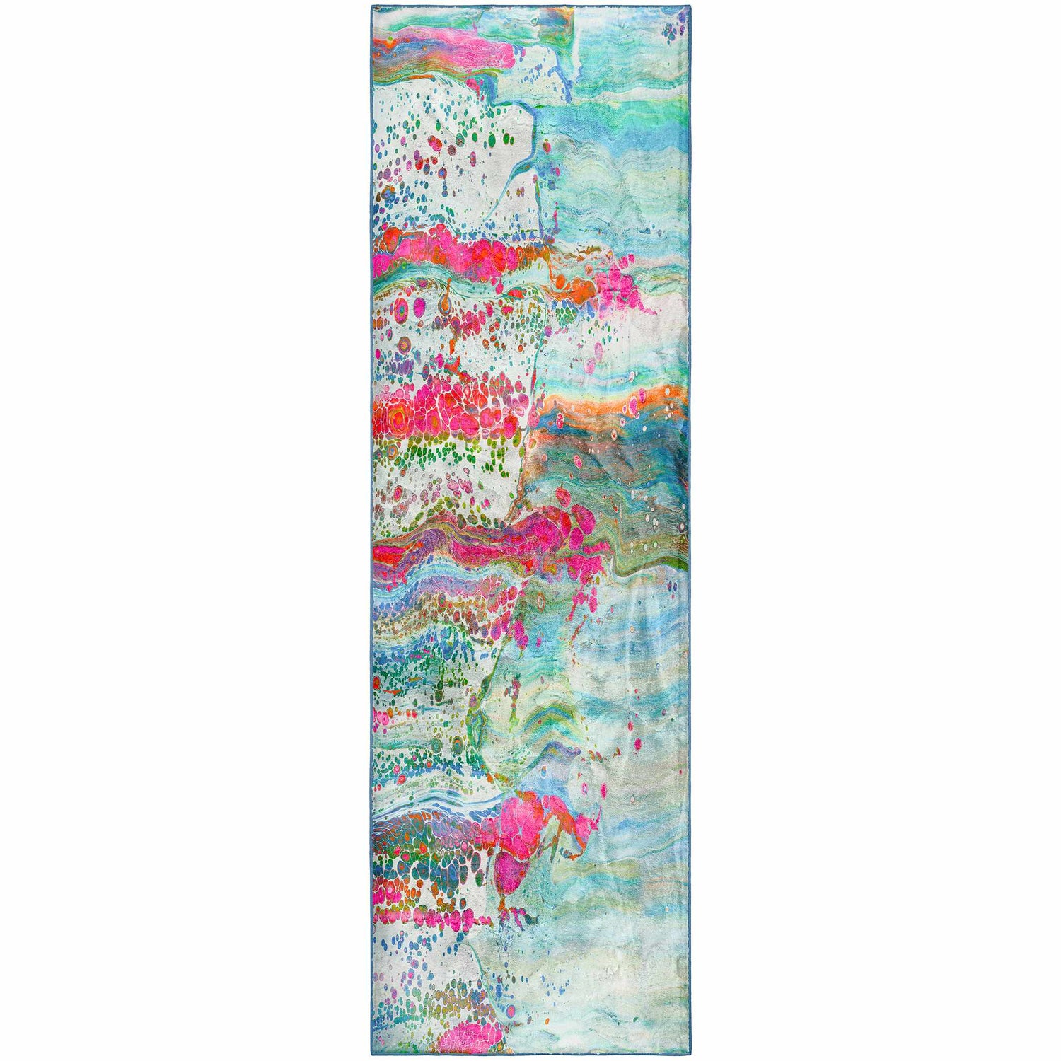 cool paletteA lush green base is splashed with streaks of red, teal, blue, pink, and purple in a free-flowing watercolor style — the overall palette feels vibrant and energetic, like a painter's canvas brought to life on your floor.