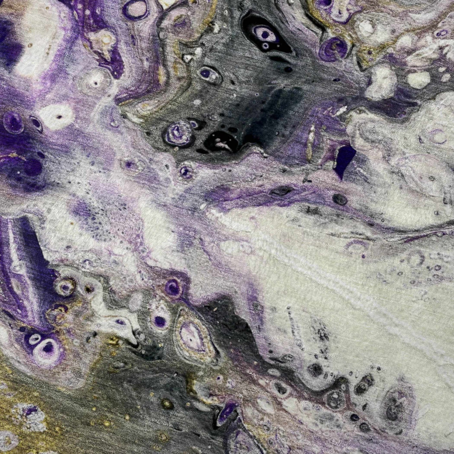 - Bold abstract pour-painting design in purple, gray, and gold