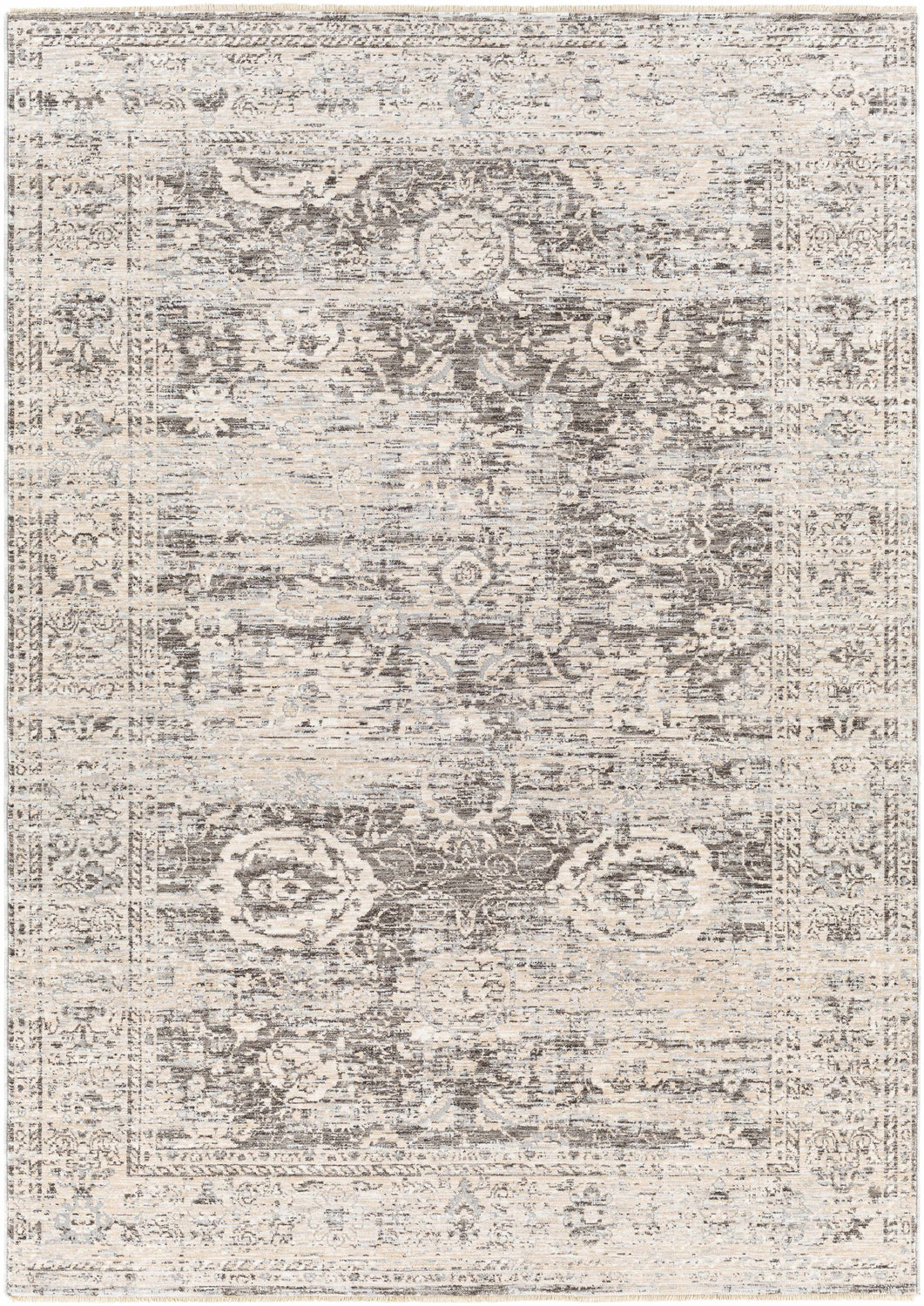 A beautifully faded Persian-inspired design in soft gray and cream — the Divisoria brings vintage character and intricate floral detail to any room, finished with classic fringe edges.