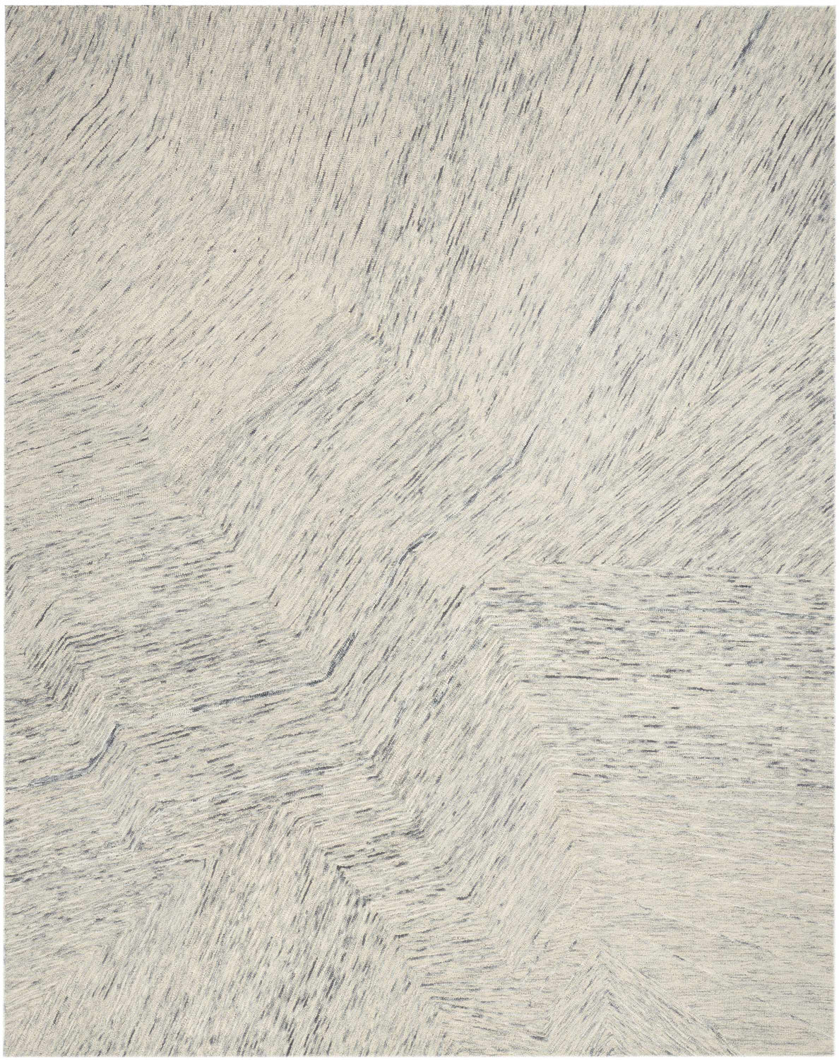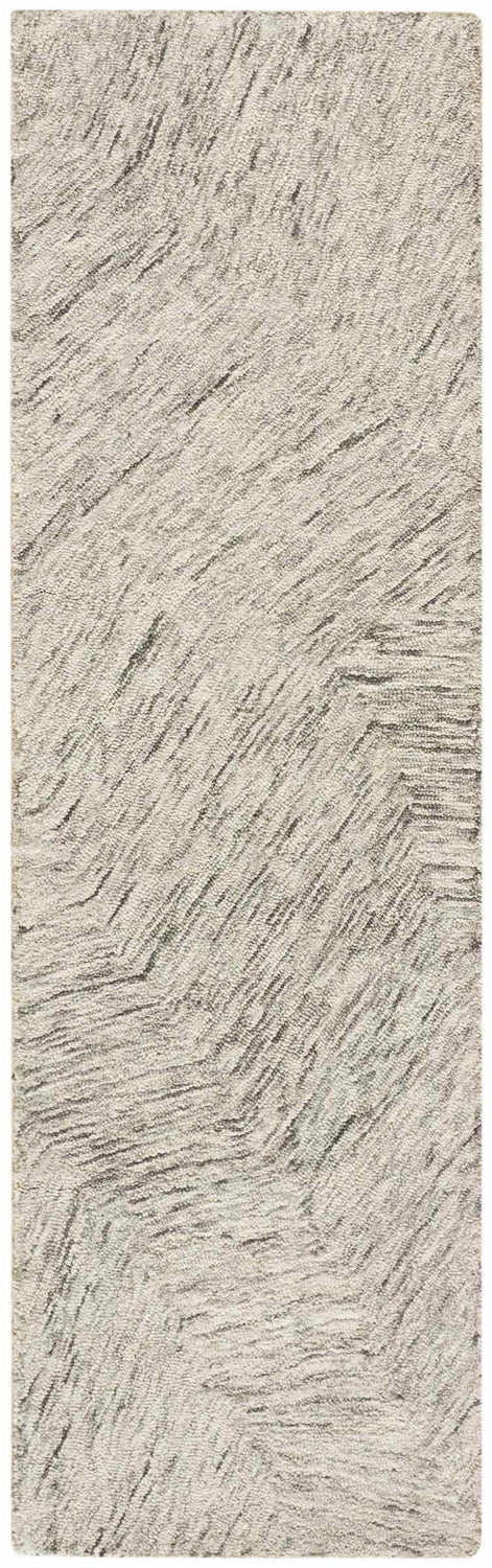 A rectangular runner-proportioned area rug with an allover abstract brushstroke pattern. The base is soft light gray with off-white and faint charcoal linear strokes running diagonally across the surface. The pattern shifts direction roughly in the center of the rug, creating a subtle chevron-like break where the diagonal lines meet at an angle — giving the design a dynamic, painterly quality. The pile is medium height with a slightly textured, hand-crafted appearance. Edges are cleanly bound with no fringe or tassels. The overall impression is of a modern abstract artwork rendered in cool, neutral tones — calm, sophisticated, and quietly striking.