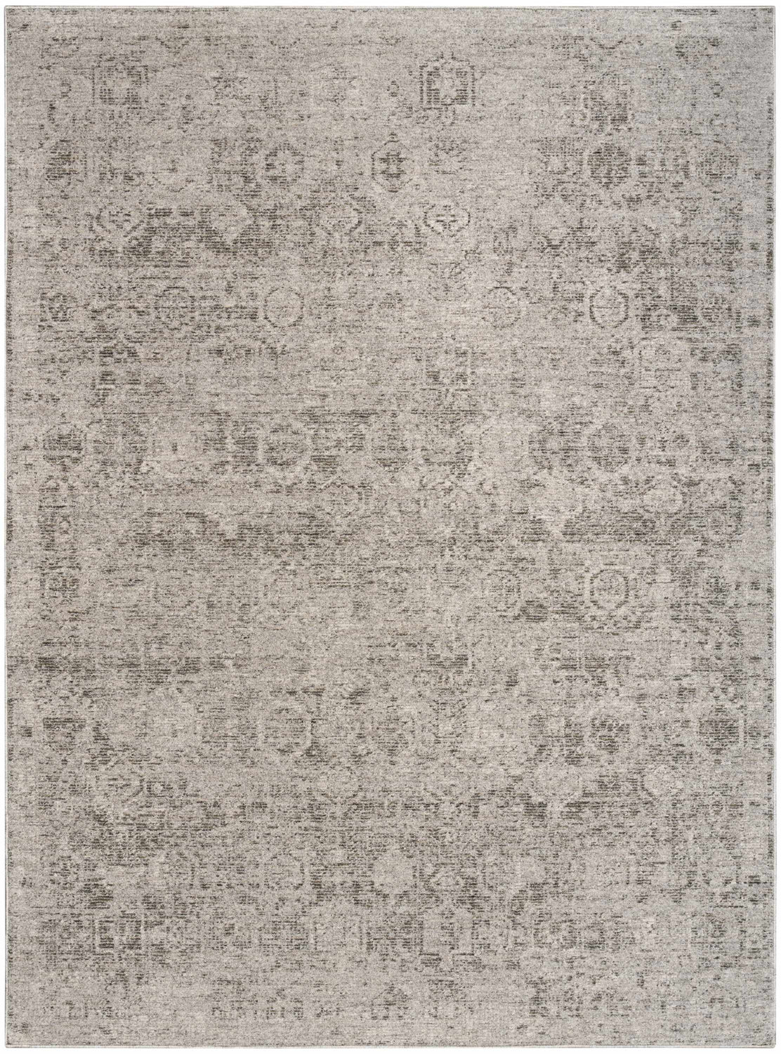 A rectangular area rug with a cool medium gray base and warm taupe and beige undertones distributed evenly across the surface. The allover pattern features a repeating traditional floral and medallion motif — small ornate floral clusters, circular medallion shapes, and delicate scrollwork arranged in a dense, symmetrical grid across the entire field. The pattern is heavily distressed and faded, giving the rug a soft, washed-out, antique appearance with no single element standing out sharply. Subtle charcoal gray detailing defines the motifs against the lighter gray ground. The pile is smooth and medium height with a machine-woven surface texture. Edges are cleanly bound with no fringe or tassels. The overall impression is of a softly aged, neutral vintage Persian-style rug with a calm, muted palette.