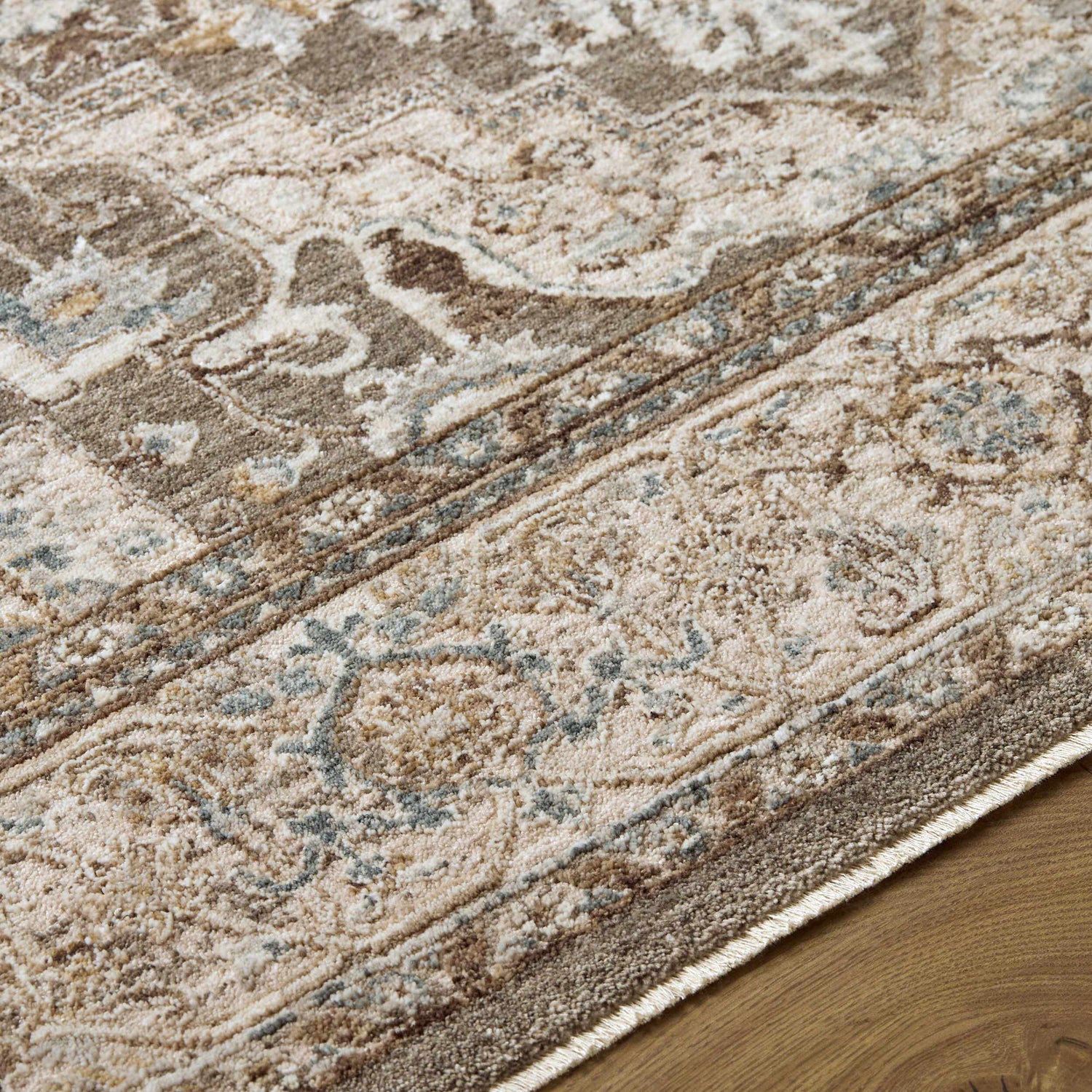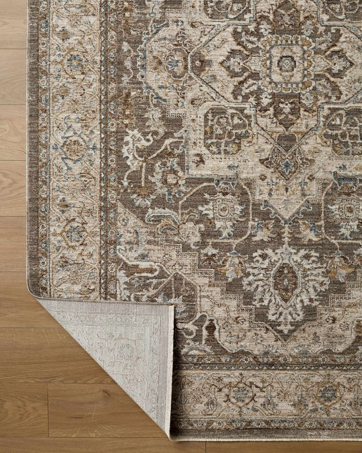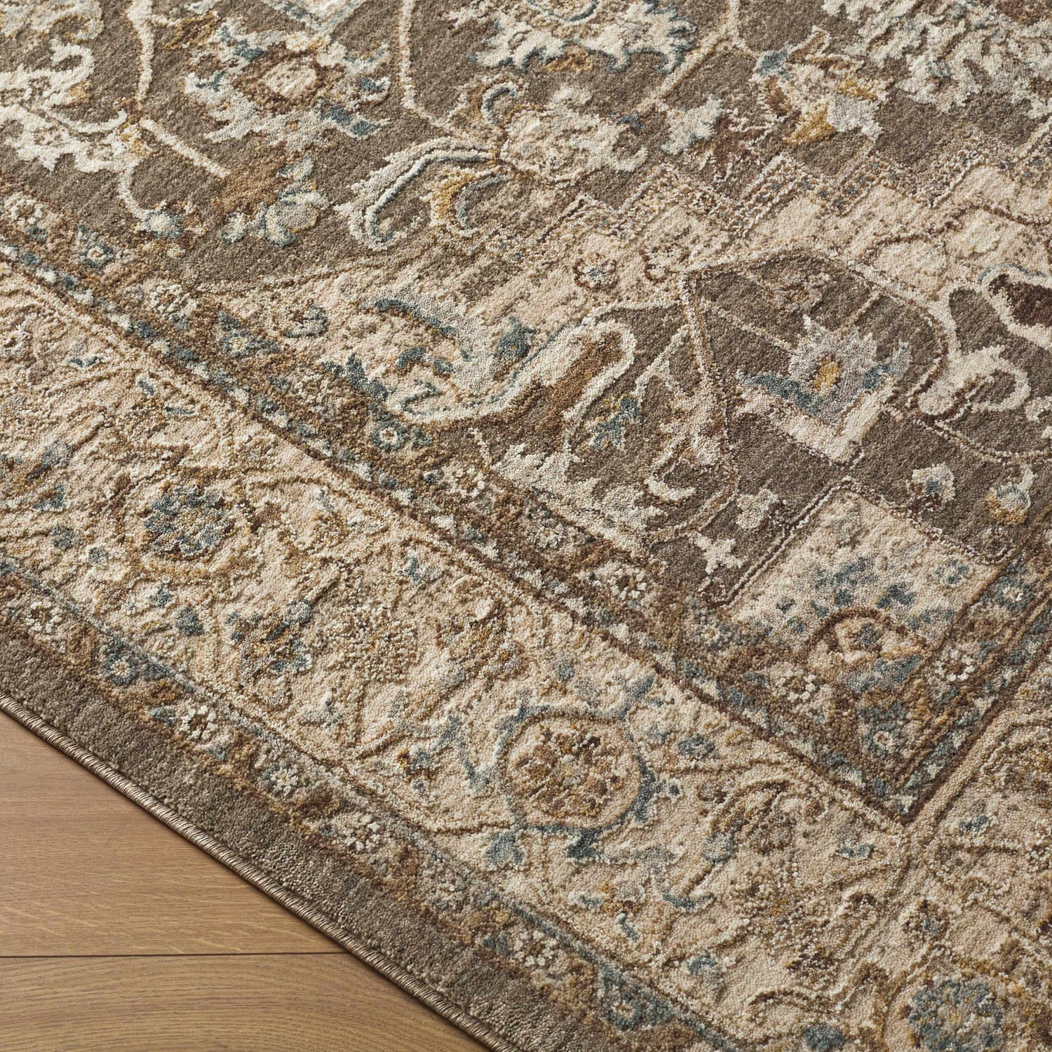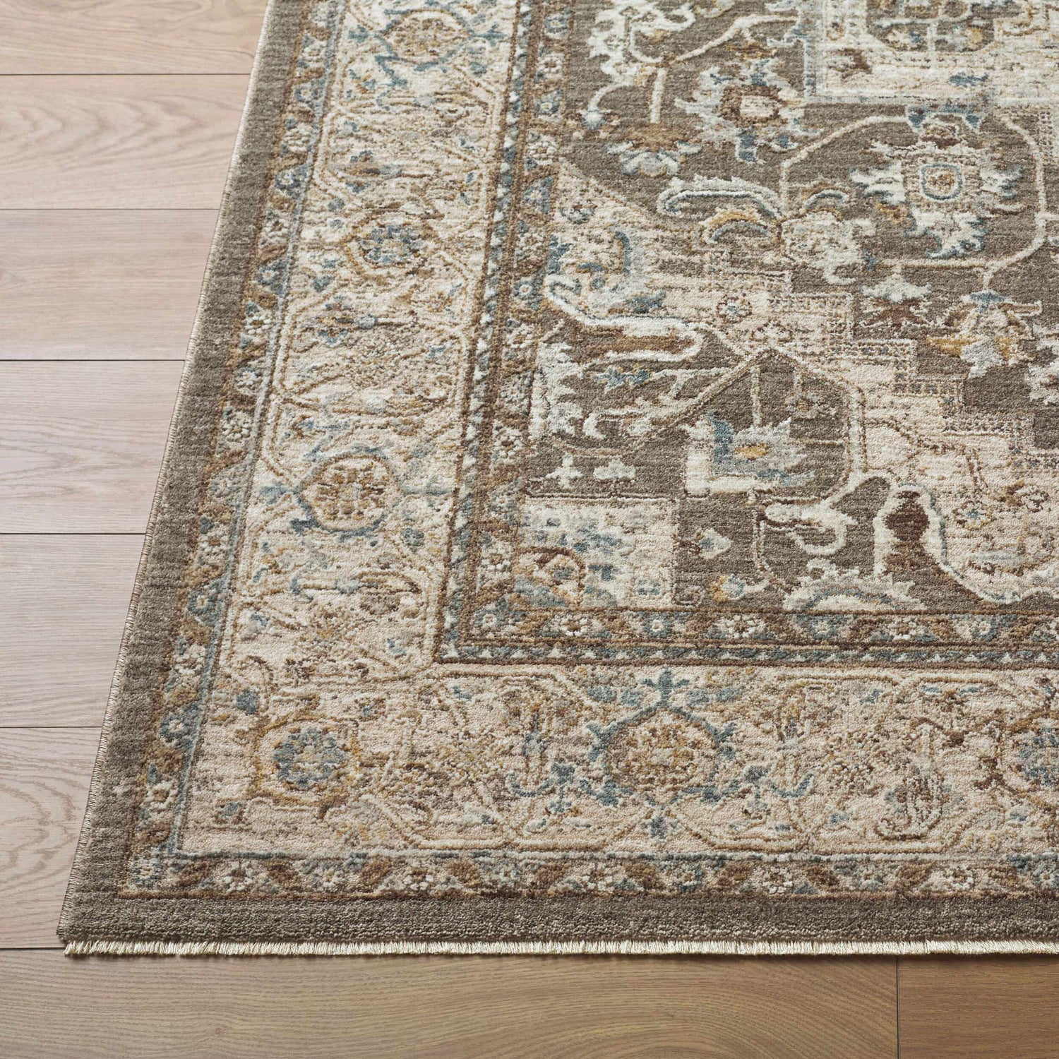 warm paletteA warm, earthy palette dominated by rich taupe and deep brown, with soft beige and cream filling the inner field and subtle light blue accents threading through the floral motifs — grounded and sophisticated without feeling heavy.
