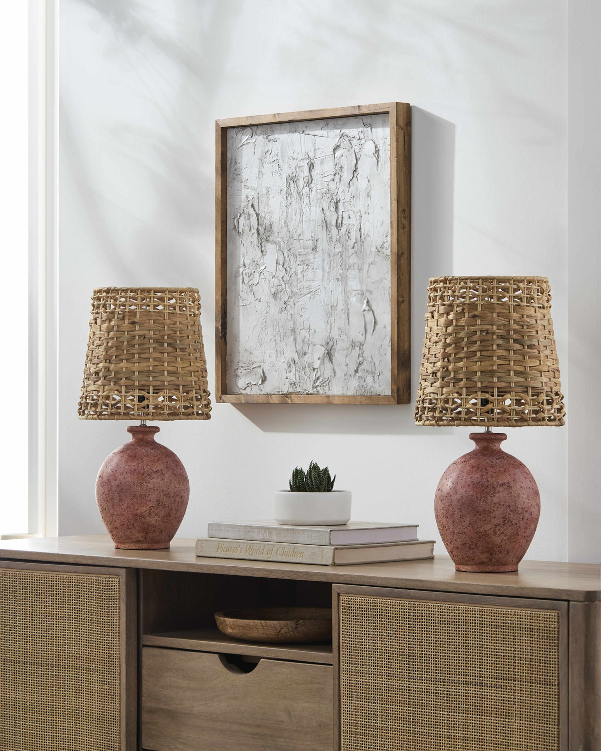 The Eberdingen Table Lamp Accent Table Lamp is an elegant addition to any space. The lamp's body is made from durable cement, providing a sleek and modern aesthetic. In contrast, the shade is woven from seagrass, adding a touch of natural charm that complements the minimalistic design perfectly. Standing at 19 inches tall, this stunning piece effortlessly elevates your home decor while also providing ample lighting for reading or working. Its maintenance is effortless - just simply wipe it with a dry cloth. However, steer clear of harsh cleaners to maintain its captivating finish for years to come. Illuminate your surroundings with the exquisite Eberdingen Table Lamp Accent Table Lamp today!