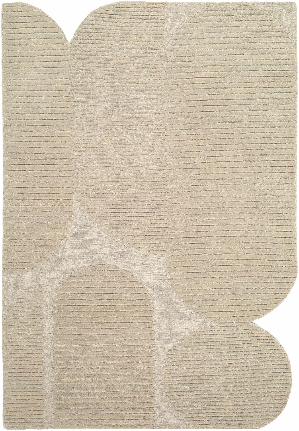 A rectangular hand-tufted wool rug in a seamless tone-on-tone palette of warm beige and soft cream. The surface features large-scale abstract shapes — tall arched forms rising from the top edge and full circles sitting at the bottom — defined not by color contrast but by the direction and texture of the pile against a finely ribbed horizontal background. The ribbing runs across the entire rug surface, creating a subtle corduroy-like texture, while the abstract motifs appear slightly smoother and more elevated. Edges are cleanly bound with no fringe or tassels. The overall impression is of a quiet, sculptural modern artwork underfoot — minimal, calm, and beautifully crafted.