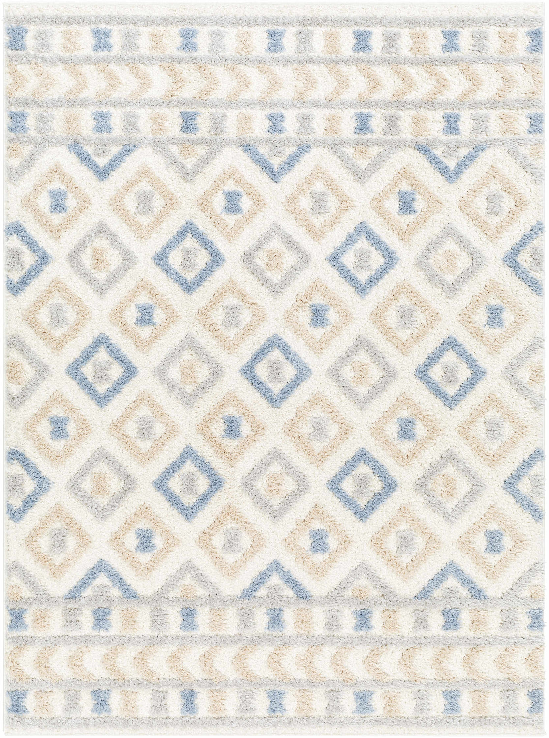 Soft cream base with pastel blue and beige diamond motifs — the Eivin brings a calm, boho-Scandinavian vibe to any living room or bedroom.